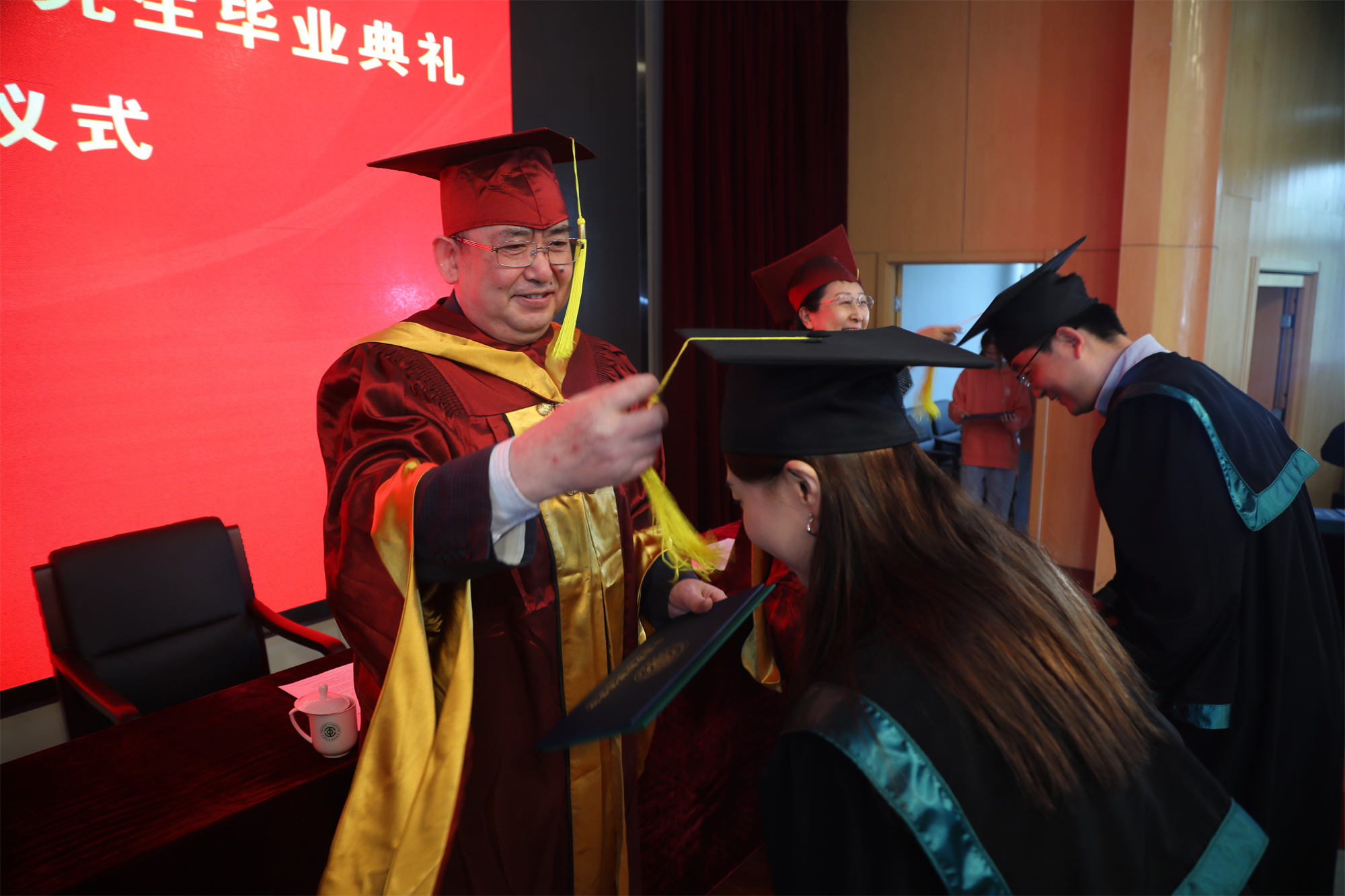 典礼上,学校领导为毕业生颁发学位证和毕业证,行拨穗礼。