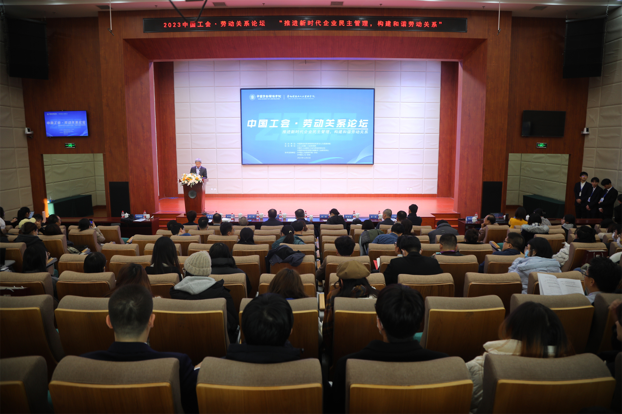 12月2日,2023中国工会·劳动关系论坛在我校北京校区举行。论坛由我校主办,《工人日报》工会新闻部、中国工人出版社工会与劳动关系分社、我校中国数字工会研究中心协办,《中国人力资源开发》杂志、《中国工人》杂志提供学术支持。本届论坛以“推进新时代企业民主管理,构建和谐劳动关系”为主题。我校党委书记、中国劳动学会副会长刘向兵,中华全国总工会基层工作部副部长黄龙,人力资源与社会保障部劳动关系司副司长刘燕,顺丰集团党委副书记曾昭霞等特邀嘉宾出席论坛。来自中国人民大学、南京大学、天津大学、中国农业大学、华南理工大学、首都经济贸易大学、河南大学、深圳大学、武汉理工大学、外交学院等高校、科研院所和国际劳工组织的专家学者,各地方、企业工会干部代表以及我校师生100余人参加论坛。