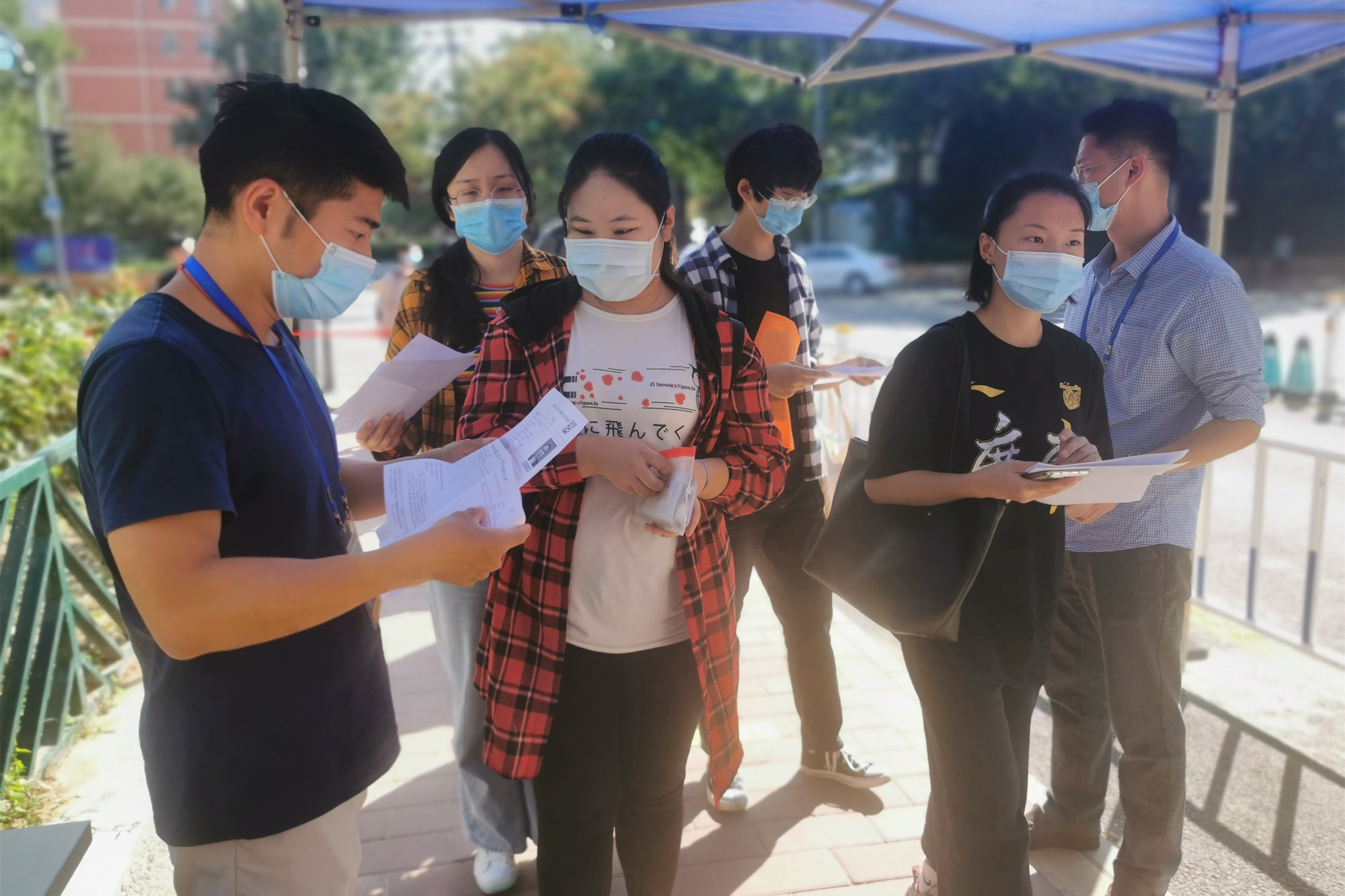 考生入校过程中,考务人员及安保人员在学校南门严格检查考生证件及核酸检测证明、测量体温,并将特殊考生及时安排至备用考场考试。考试中,监考教师及考务人员认真履行职责,严格考试规程。
