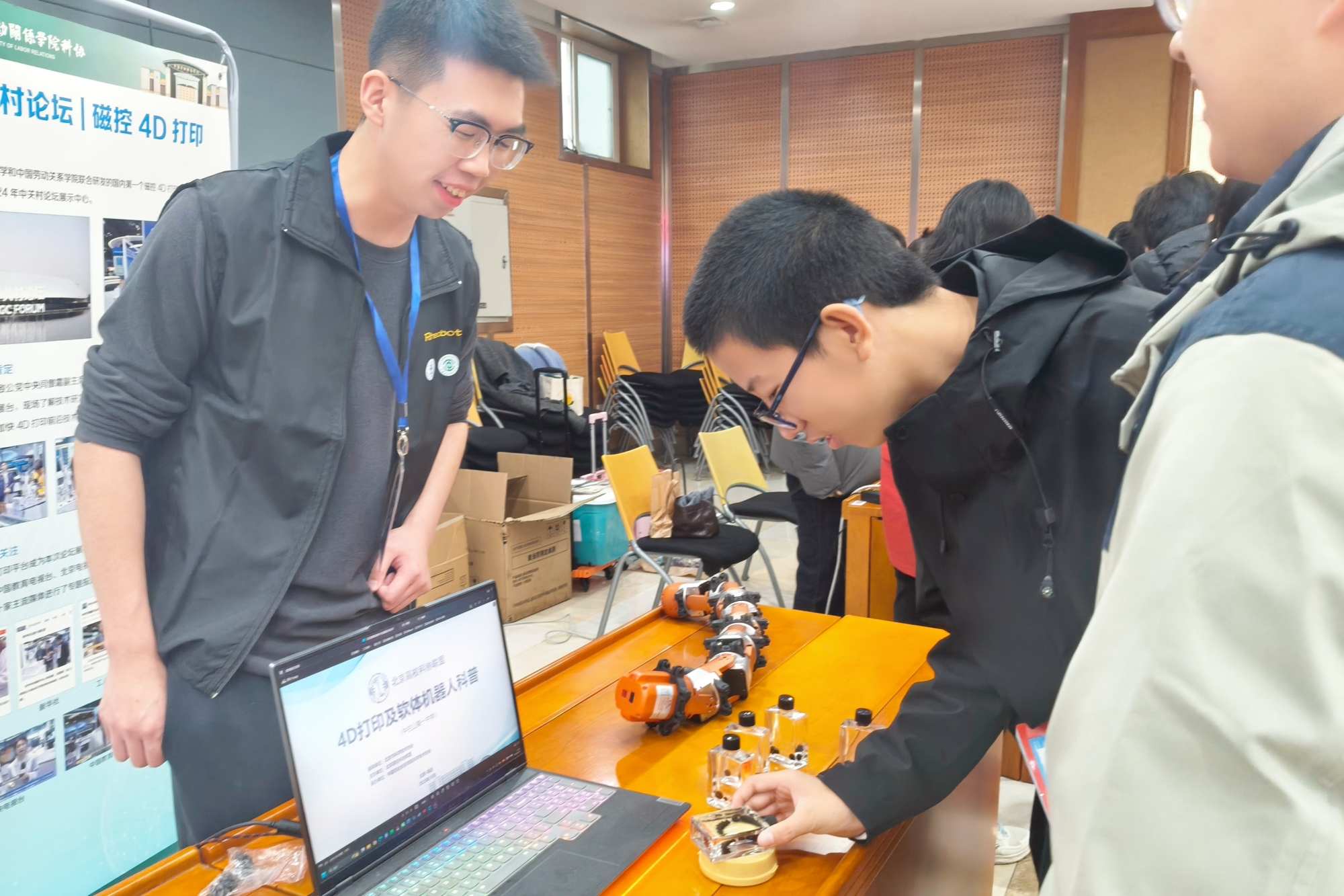展示过程中,团队成员采用“原理讲解+互动体验”的方式,详细讲解了相关技术的原理与操作流程,让抽象的理论具象化,团队还精心设计了多个互动体验环节,让学生们亲手操作磁控设备,体验4D打印过程,感受智能材料的神奇特性。
