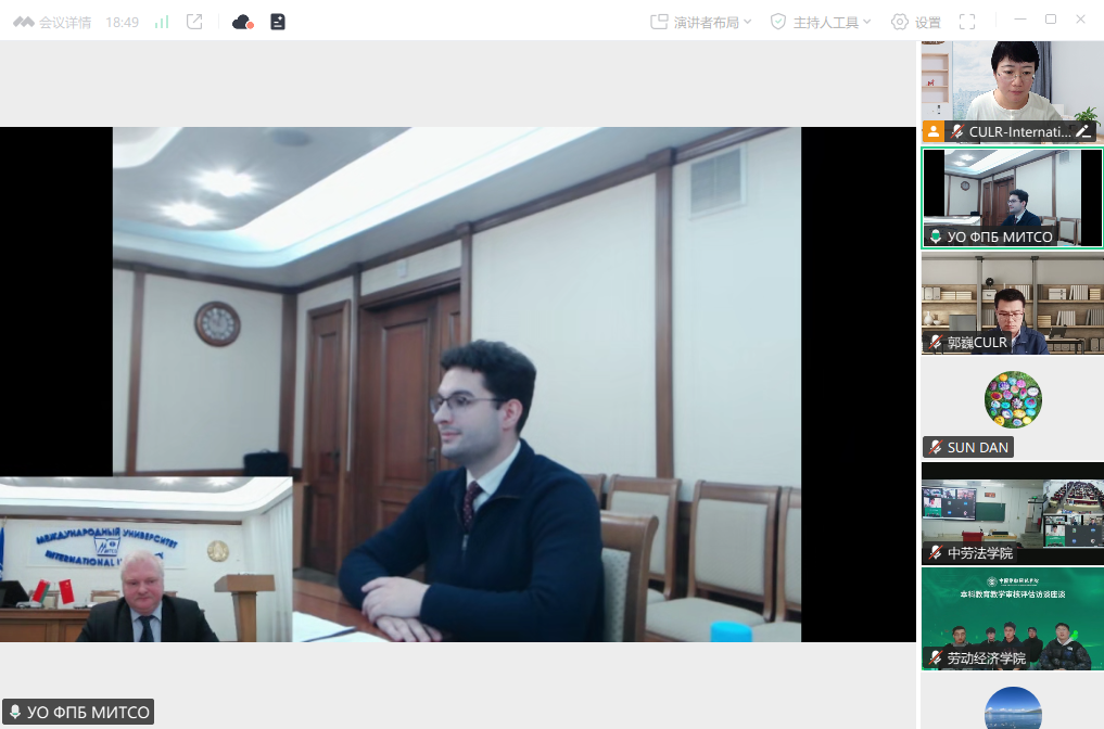 3月13日下午,我校线上举办白俄罗斯国际劳动与社会关系学院留学项目宣讲会。白俄罗斯国际劳动与社会关系学院(以下简称“白方”)国际交流合作处处长奥列格·库钦斯基、副处长罗曼·内海,我校国际交流合作处、法学院相关负责人,劳动经济学院、文化传播学院教师代表及近百名学生共同参会。