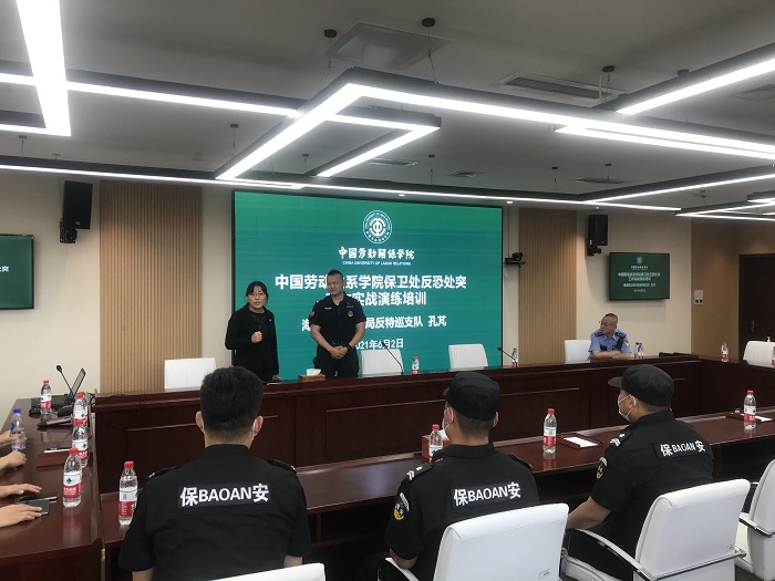 6月2日下午,我处特邀北京市公安局海淀公安分局反特巡支队孔芃警官为保卫处在京教职工及北京校区保安队进行反恐处突工作实战演练培训,海淀分局高校内保大队程长昊警官、甘家口派出所石明进警官一并出席培训会。此次培训分为课堂反恐处突理论知识讲解及反恐处突模拟实战演练。孔芃警官以浅显易懂、诙谐幽默的语言向参与培训人员讲述专业反恐处突知识。