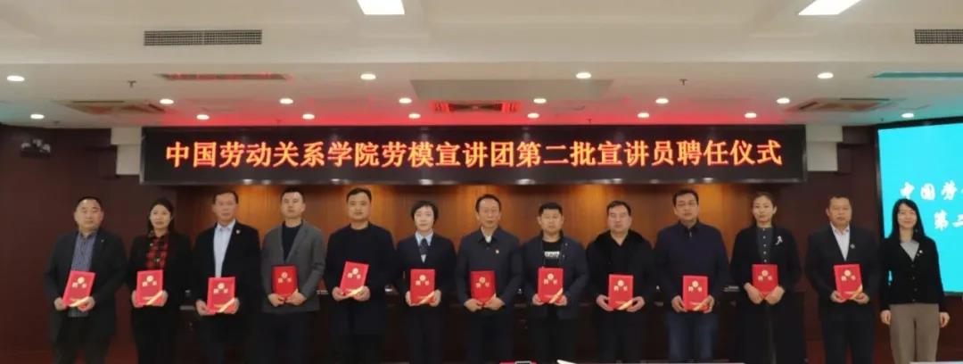 聘任仪式上,劳模学院院长纪元宣读了《关于聘任中国劳动关系学院劳模宣讲团第二批宣讲员的通知》,宣布劳模学院蔡凤辉等19名同学被聘为我校劳模宣讲团第二批宣讲员,聘期四年。党总支书记高丽萍为受聘的宣讲员代表颁发聘书。