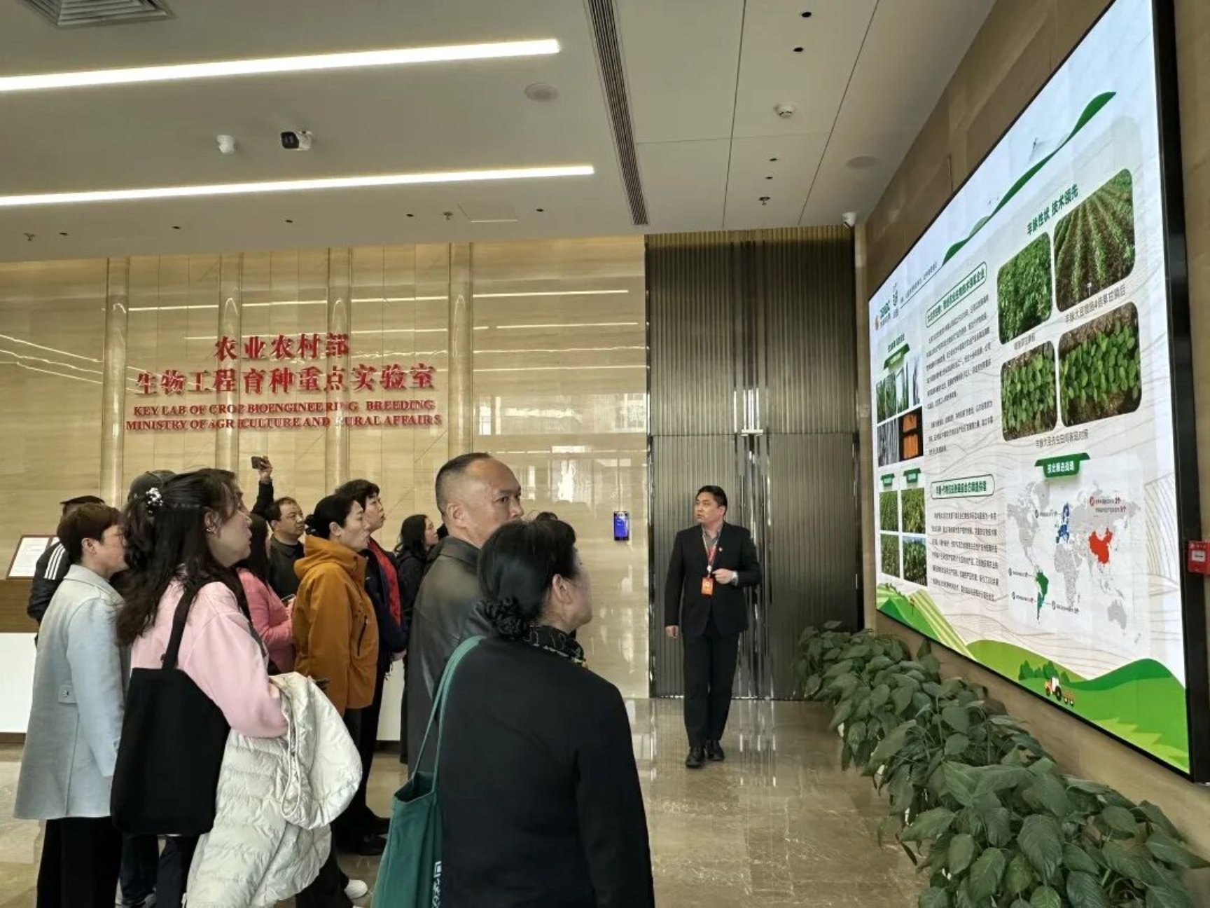 在北京市劳动模范,北京大北农科技集团股份有限公司生物育种创新中心安全评价工程师、高级农艺师汤波的引导下,劳模学生参观了绿色生物制造全国重点实验室、生物育种实验室及企业成果展示区,全面了解了集团在优质农产品溯源、生物制造等前沿领域的创新成果。在农业农村部生物工程育种重点实验室,劳模学生近距离观摩了先进的生物育种设备,深入了解了超强抗倒伏玉米等标志性成果,切实感受科技为传统农业带来的深刻变革。