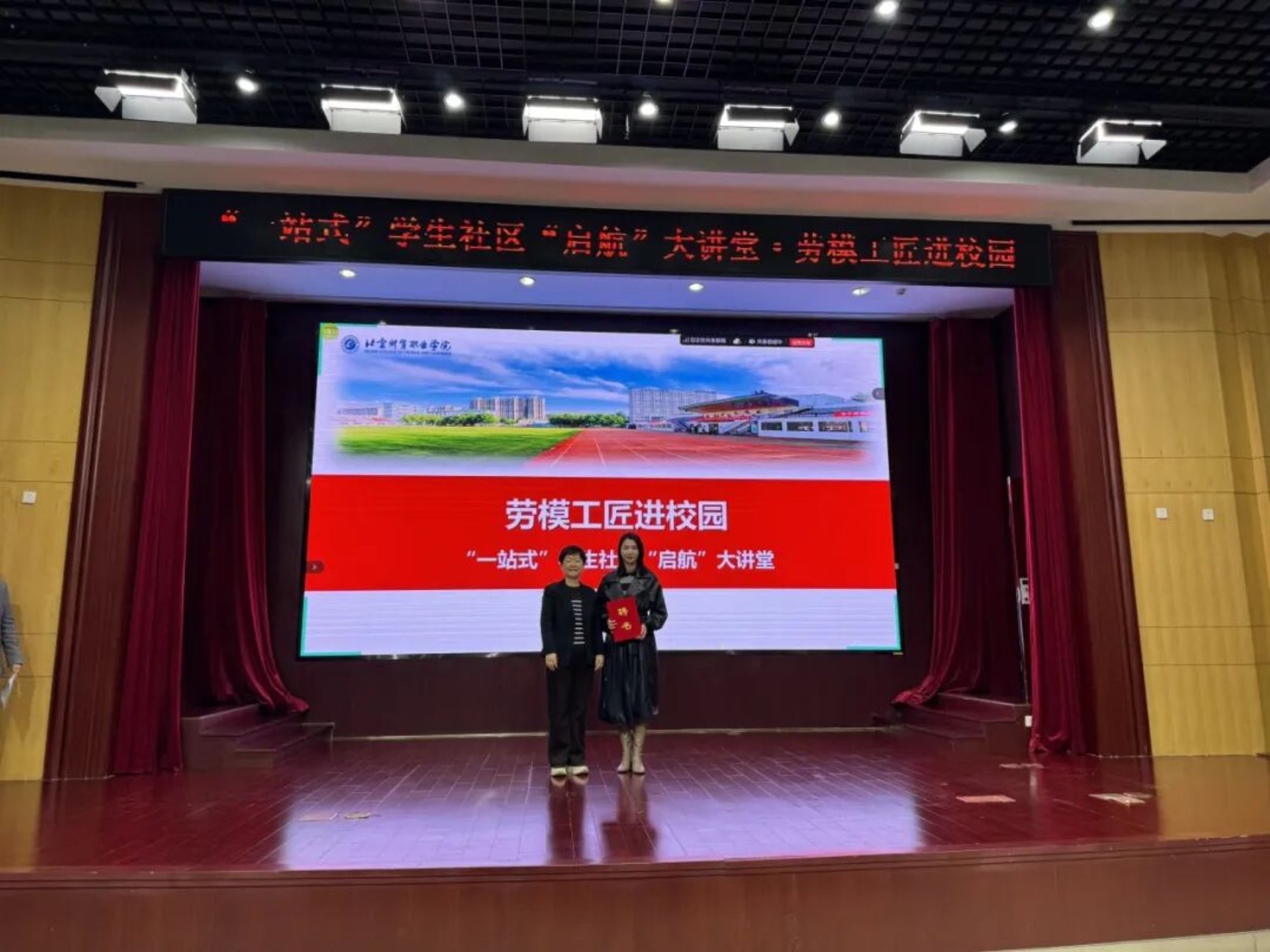 谭羽轩结合自身在文旅行业的丰富阅历,用质朴的语言回顾成长蜕变之旅,以“勇敢、热爱、坚持、好学”八字箴言寄语青年学子,鼓励大家在成长道路上不畏艰难险阻、坚持深耕细作,在文旅领域脚踏实地锤炼本领。在“与劳动模范面对面”互动环节中,谭羽轩围绕专业学习与能力提升、行业发展前沿动态及个人职业规划等内容,与同学们进行深入交流。谭羽轩来自行业一线的真实感悟深深触动了在场的每一位学子,让大家看到了文旅行业的无限可能,也更加坚定了专业选择的信心。北京财贸职业学院领导为谭羽轩颁发“一站式”学生社区导师聘书,持续助力学生全面发展。
