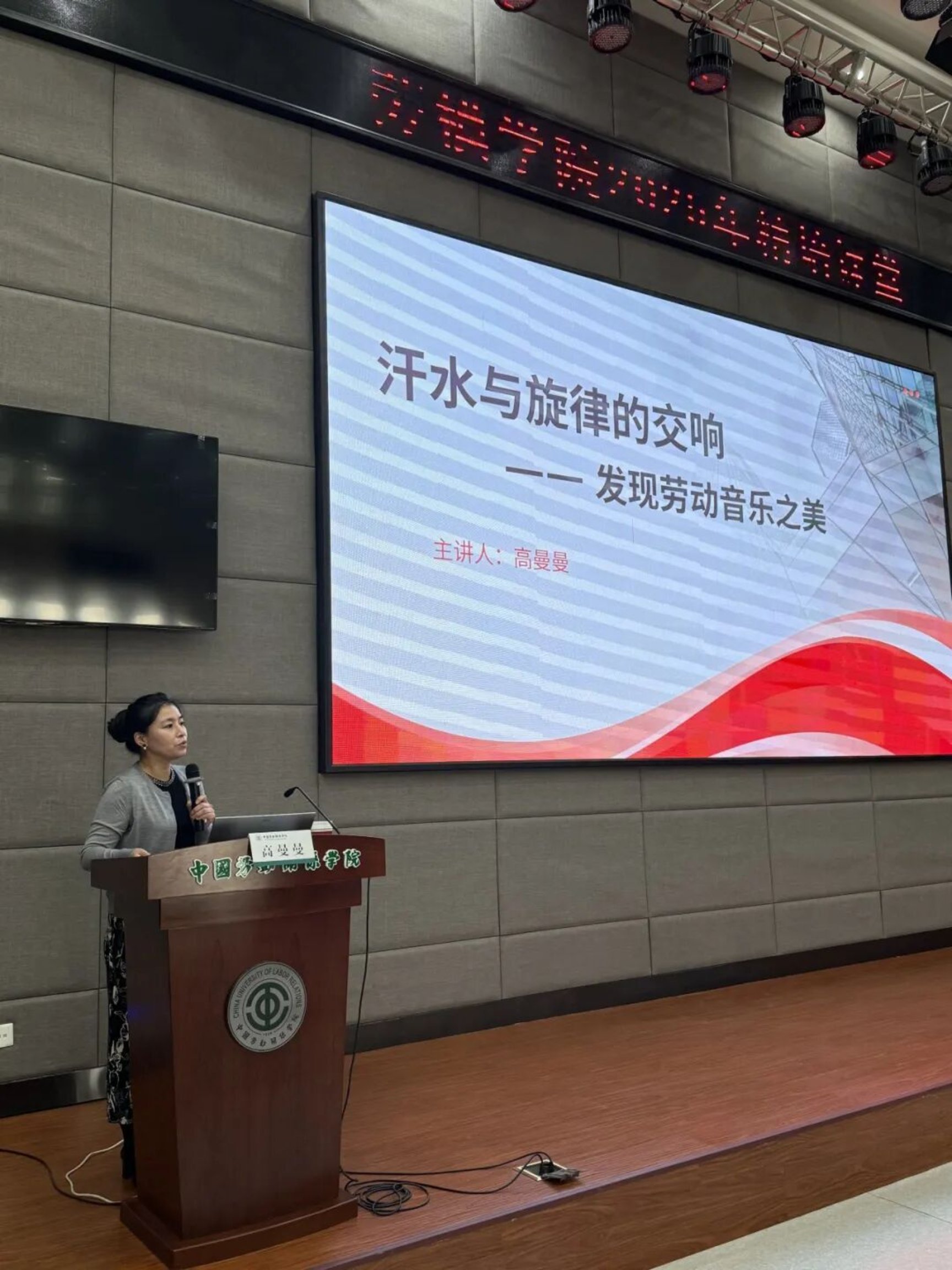 高曼曼老师以劳动音乐的起源与价值为切入点,生动诠释了劳动音乐的三种形式,详细阐述了劳动音乐的时代变迁。从抒发劳动情感的号子、山歌,到展现地域风情的小调、民歌,从传统的积淀到时代的创新,劳动音乐的美贯穿于劳动者的每一滴汗水与每一段旋律之中。劳模师生充分感受到劳动音乐的独特魅力,体悟到劳动精神的时代传承。