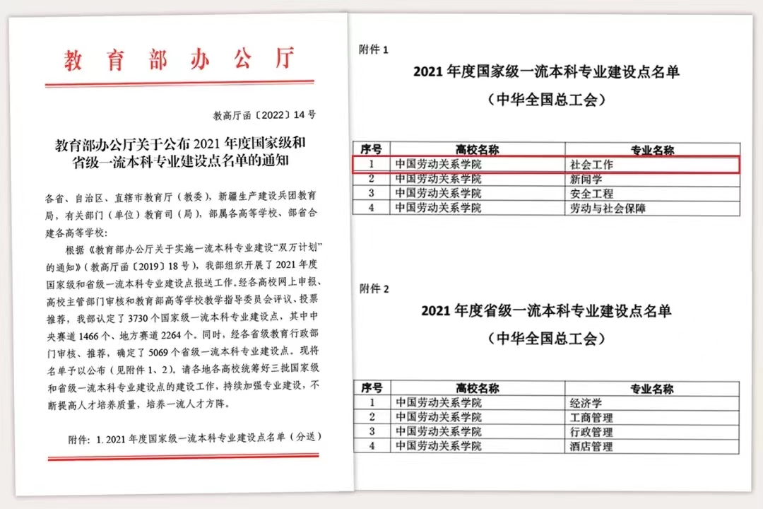 近日,教育部发布《教育部办公厅关于公布2021年度国家级和省级一流本科专业建设点名单的通知》(高教厅函〔2022〕14号),我院社会工作专业获得国家一流本科专业建设点。