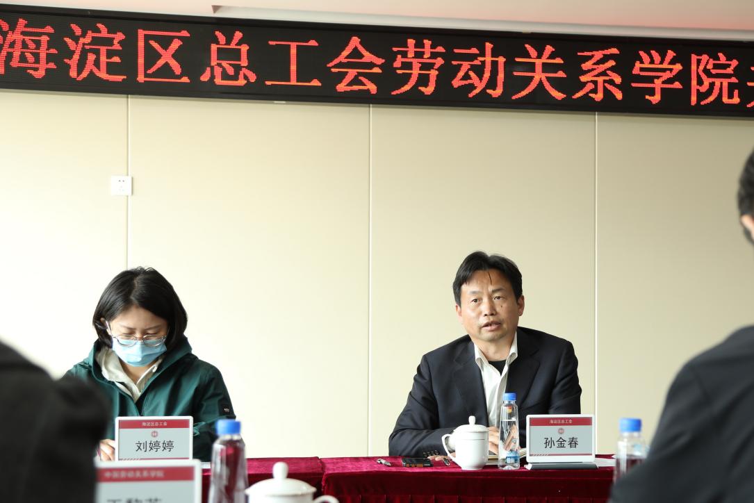 孙金春书记作最后总结发言。他用“一家人”来形容海淀区总工会和中国劳动关系学院的关系,对叶鹏飞院长关于双方加强合作的愿望表示赞同。他提出,工会各部门尽可能多的为实习生提供实践机会、协助实习生开拓眼界,让实习生看到基层工会工作面临的堵点和难点,让新鲜血液的融入成为提高工会生机和活力的契机。