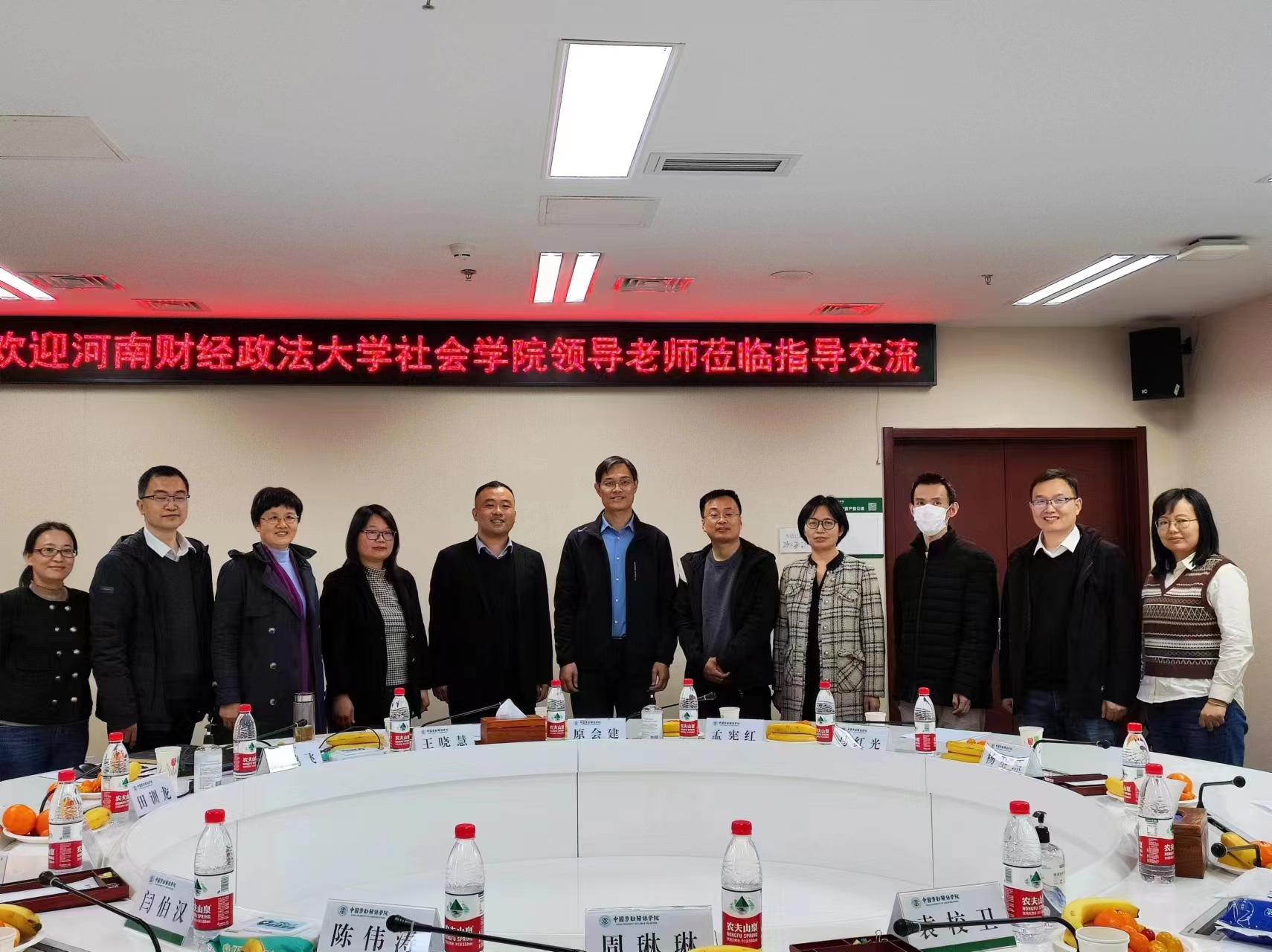 2023年3月27日下午,河南财经政法大学社会学院院长田训龙、副院长王莹、副院长闫伯汉、副院长陈伟涛、社会学教研室主任周琳琳、社会工作教研室主任袁校卫一行六人来我院进行调研,交流社会工作、社会学的专业建设和学科发展问题。我院执行院长叶鹏飞、副院长王晓慧、副院长兼社会工作系主任原会建、社会学系主任马红光、实践教研室主任孟宪红、办公室主任杨基燕、教学秘书张弯弯等参加了此次交流活动。