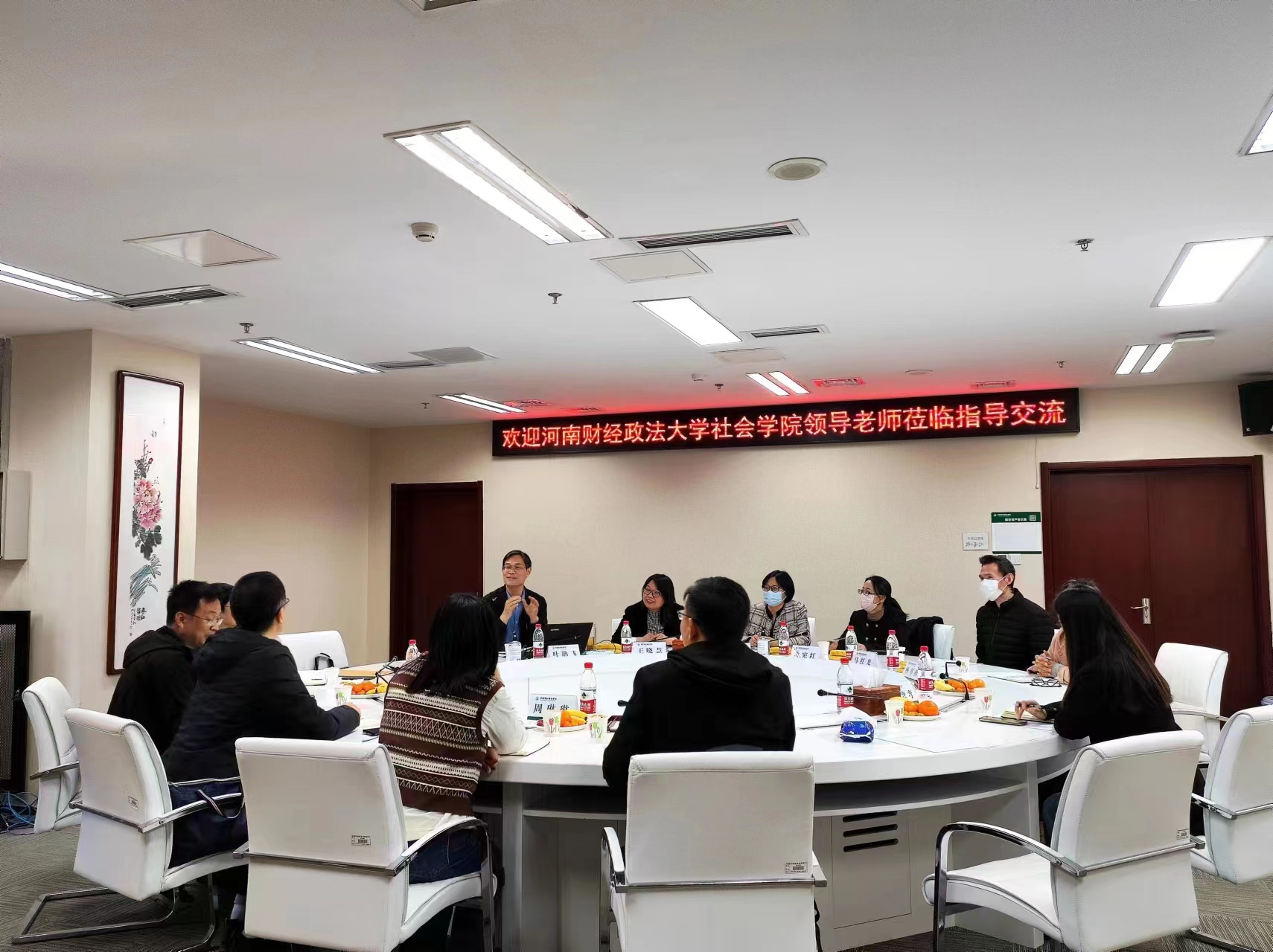 叶鹏飞院长首先对田训龙院长一行的来访表示热烈欢迎,表示我校与河南财经政法大学同属行业特色型大学,社会学、社会工作学科发展、专业建设、人才培养等方面具有很多共性,加强交流对各自发展都具有积极意义。随后,他从我院学科发展体系、人才培养定位、教学科研团队与平台建设、课程体系与实践教学体系、发展成效等方面进行了介绍,分享了学院发展过程中“突出特色、融入主流、开放创新、强化应用”的基本经验,同时分析了学院未来发展面临的困难挑战。