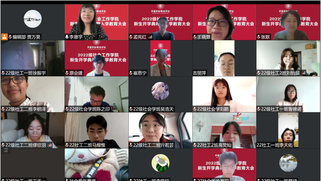 2022年9月3日上午,社会工作学院于腾讯会议上举办2022级新生开学典礼暨入学教育大会。我校副校长兼社会工作学院院长刘丽红、执行院长叶鹏飞、名誉院长张默、党总支书记焦园媛、教学副院长王晓慧、科研副院长兼社会工作系主任原会建、社会学系主任马红光、心理教研室主任刘曦、实践教学教研室主任孟宪红、各教研室教师、教学秘书、辅导员以及在校学生代表参加了本次大会,2022级103名新生全部到会。典礼及大会由辅导员李惠宇主持。