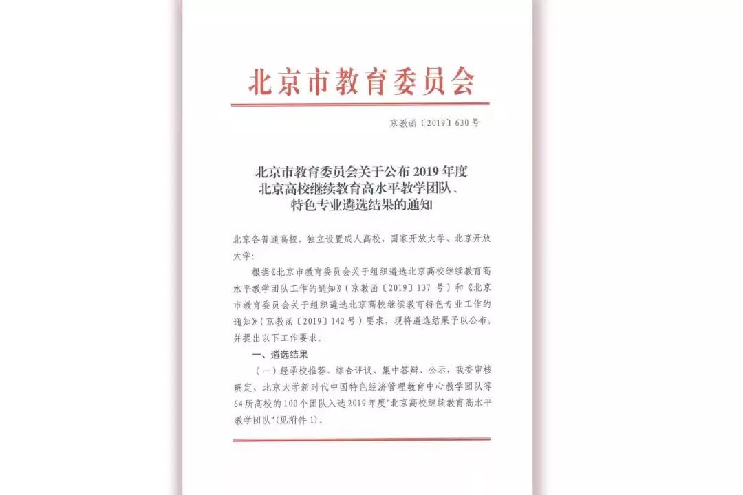 近日,北京市教育委员会发布《北京市教育委员会关于公布2019年度北京高校继续教育高水平教学团队、特色专业遴选结果的通知》(京教函〔2019〕630号)。
