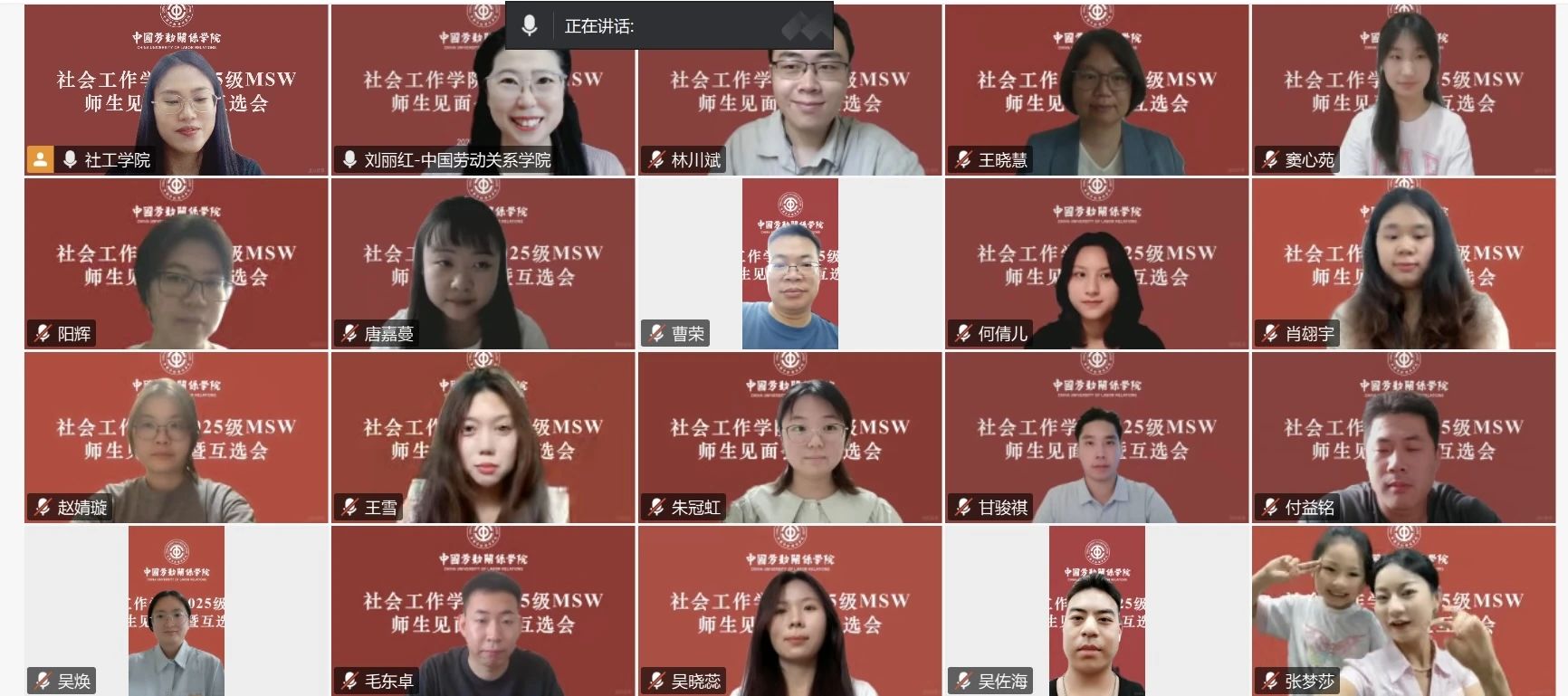 2025年7月7日14:00至16:00,社会工作学院通过线上平台成功举办了2025级社会工作专业硕士研究生(MSW)师生见面会暨互选会。中国劳动关系学院党委常委、副校长刘丽红、社会工作学院教学副院长王晓慧、研究生导师及2025级MSW新生共同参加了会议。会议由研究生教学秘书张弯弯主持。
