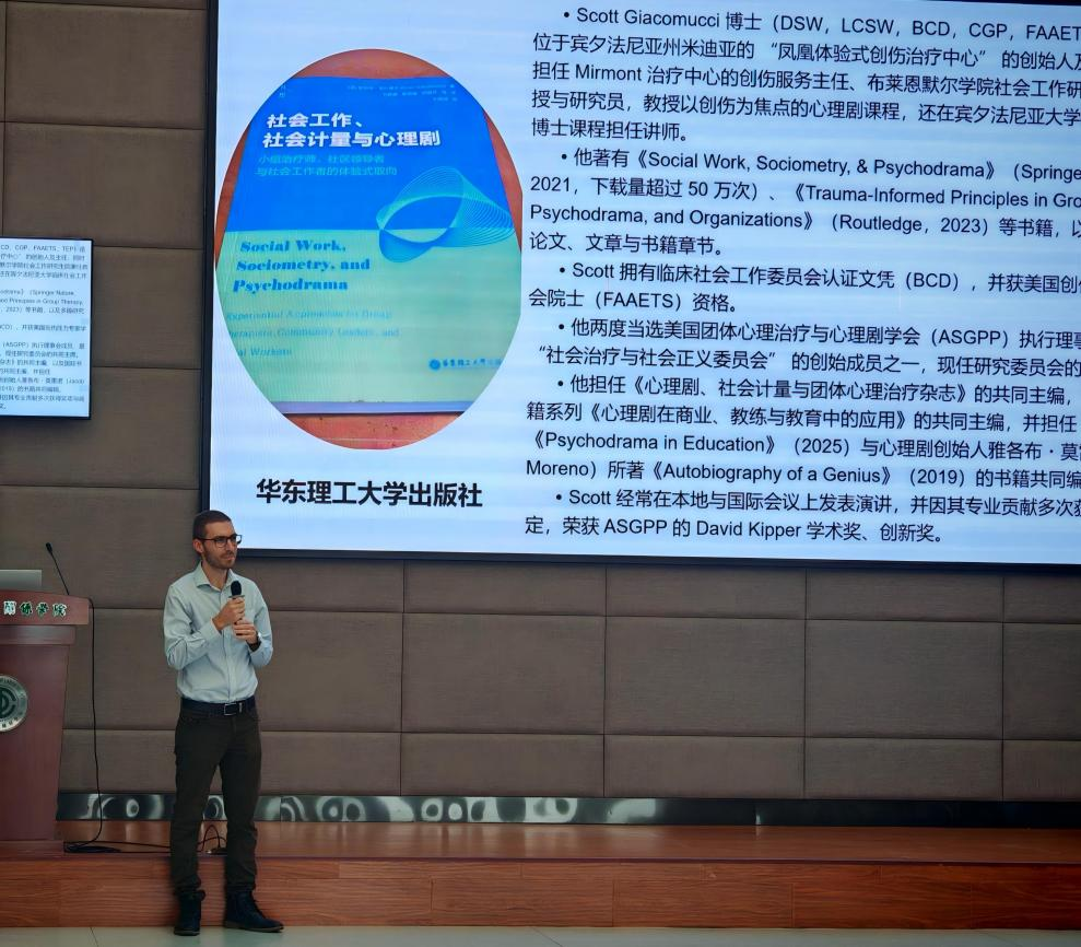 8月12日的主题为“社会工作、社会计量与心理剧”,在课程中,贾科穆西教授首先回顾了心理剧创始人雅各布·莫雷诺(Jacob L. Moreno)的生平与思想渊源,介绍了其在20世纪提出的“心理剧”“社会计量”等核心理论。他指出,莫雷诺不仅是一位精神科医生,更是一位社会思想家,他提出的社会计量(Sociometry)为理解群体关系和社会网络提供了系统化方法。在社会工作领域,这一理论有助于发现并改善个体在社会结构中的位置,促进关系网络的修复与发展。