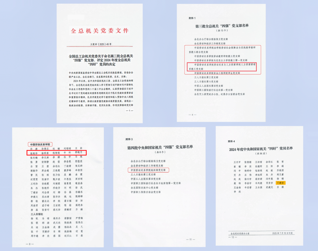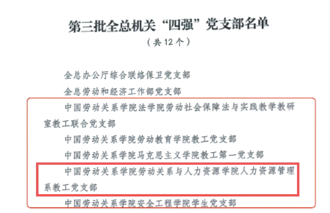 近日,中央和国家机关工委命名第四批中央和国家机关“四强”党支部、评定2024年度中央和国家机关“四好”党员,全总机关党委命名第三批全总机关“四强”党支部、评定2024年度全总机关“四好”党员。我院人力资源管理系教工党支部荣获第三批全总机关“四强”党支部,5位教师荣获2024年度全总机关“四好”党员称号。佳绩迭出,生动彰显了我院以高质量党建为引领,在推动事业发展中取得的显著成效。