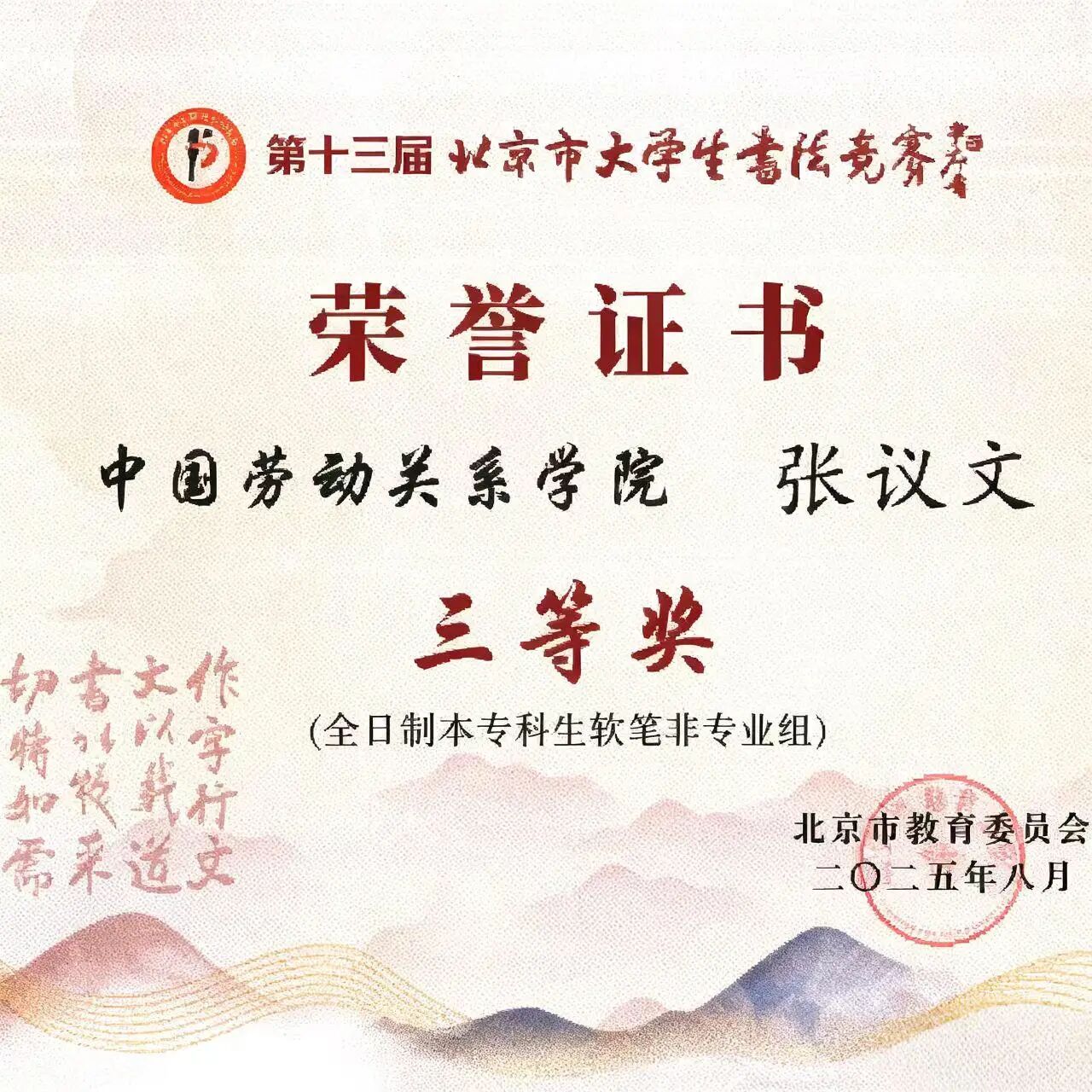 近日,第十三届北京市大学生书法大赛结果揭晓,我校学子凭借扎实功底与出色表现,斩获多项个人奖项。其中,我院2023级人力资源管理专业学生张议文荣获软笔非专业组三等奖。