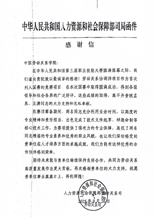 近日,人力资源和社会保障部劳动关系司向我校发来感谢信,对劳动关系与人力资源学院教师孟泉、王潇在第三届职业技能大赛劳动关系协调师赛项中的突出贡献表示高度肯定与诚挚感谢。