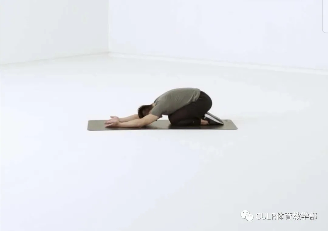步骤:身体自然而放松地向前趴下;臀部坐在脚后跟上,手臂向前延伸