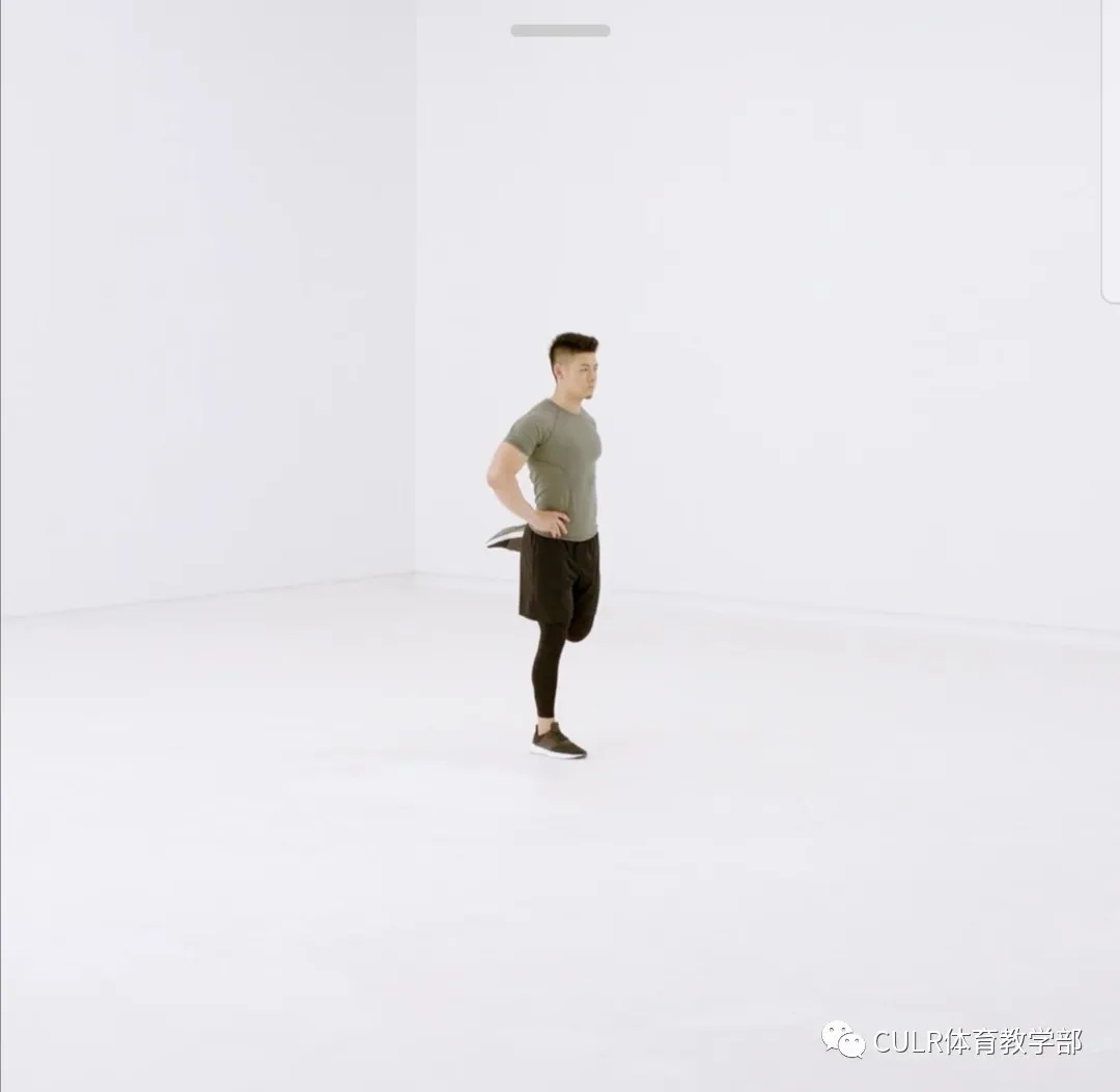 步骤:双脚与肩同宽站立,双手自然下垂,双腿微屈,重心移到一条腿上,另一条腿屈膝向后,同侧手迎合屈起的腿,并抱住脚背;人整体向上,手抱住脚背并向臀部贴近,感受大腿前侧的牵拉感,换另一侧重复