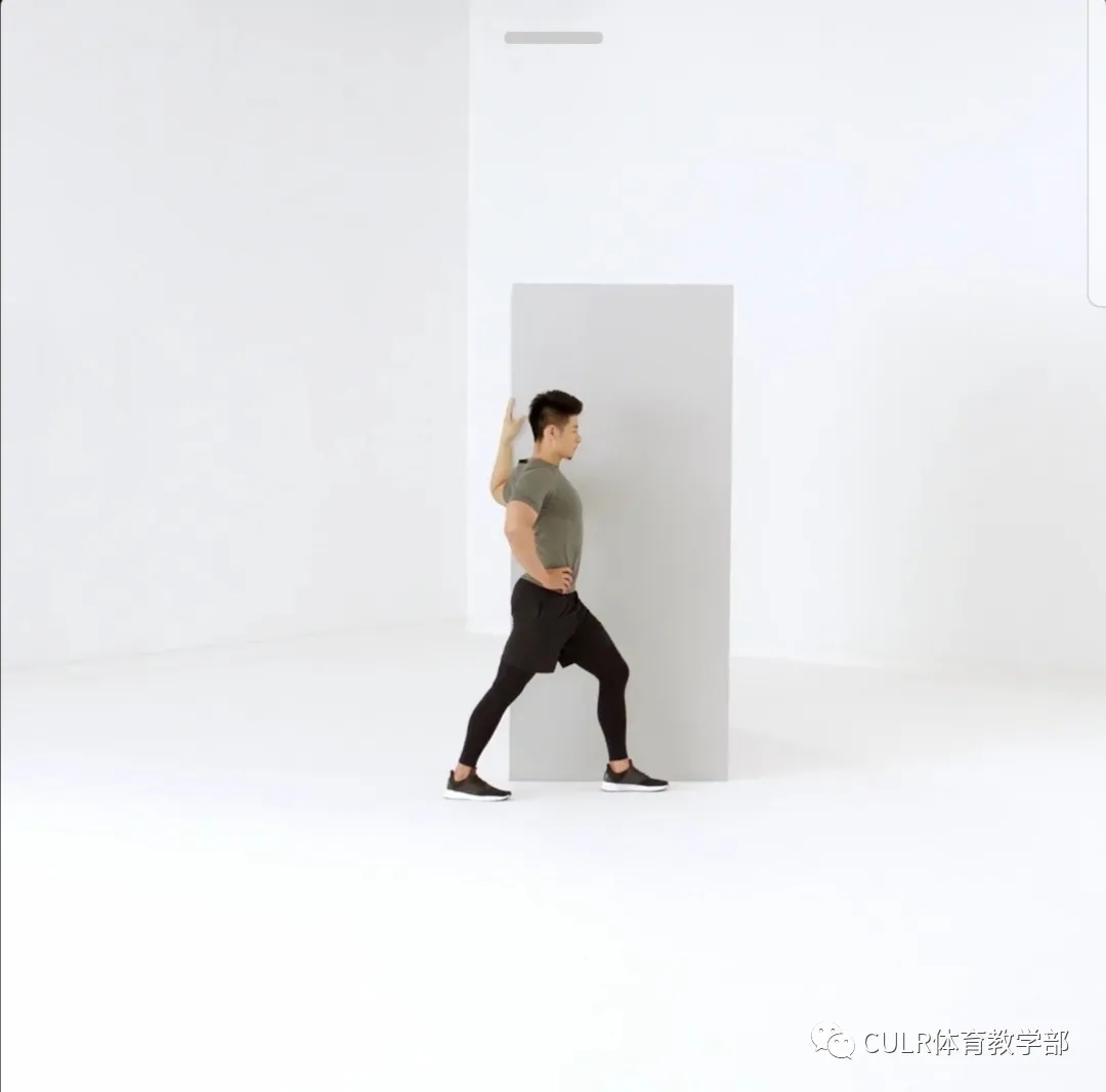 步骤:左(右)腿弓步在前,右(左)手叉腰;左(右)肩略微耸起,左(右)侧小臂和手掌贴紧墙面,大臂平行于地面;上身前移且向右(左)扭转,感受左(右)侧胸部的牵拉感