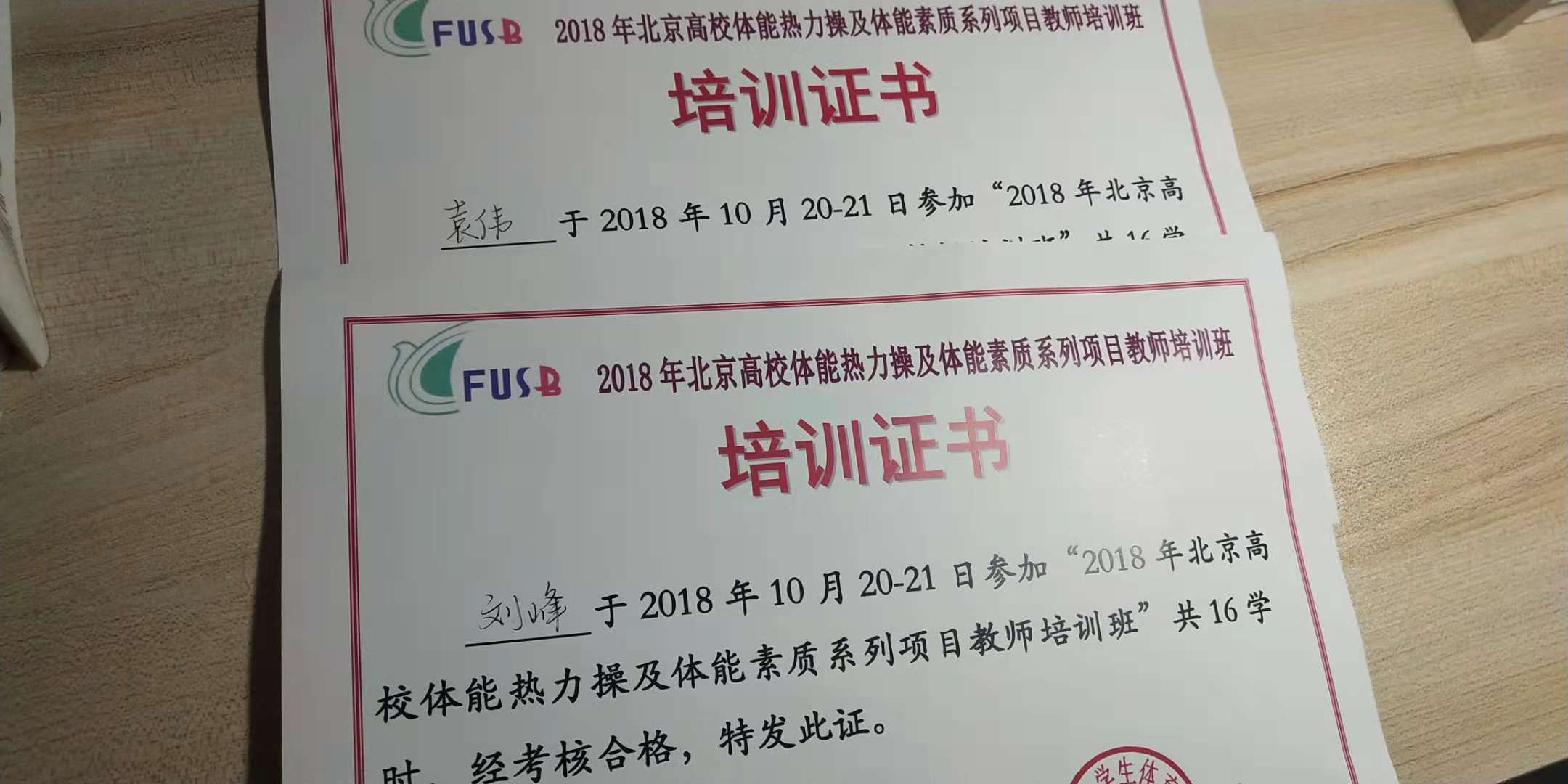 10月20日,我校体育教学部袁伟老师和刘峰老师在国际关系学院参加了由北京市大学生体育协会主办,为期两天的2018年首都大学生阳光体育体能挑战赛-大学生体能热力操及体能素质挑战赛系列项目教师培训班,为贯彻党的十九大精神和习近平总书记关于学生体育工作的重要指示精神,落实《青少年体育活动促进计划》,推动大学生体能热力操系列项目在北京高校的开展。培训期间,我校两位代表认真积极参与培训,并与其他高校老师进行了密切交流。