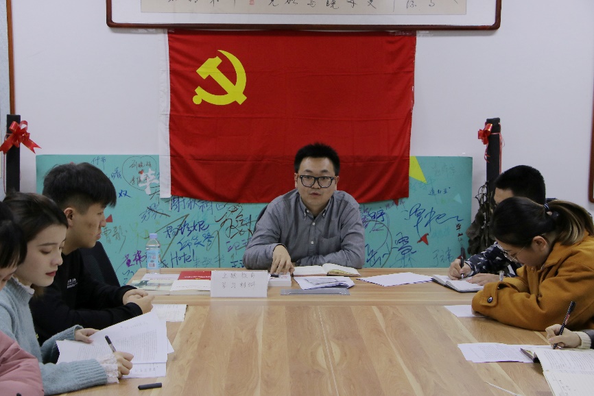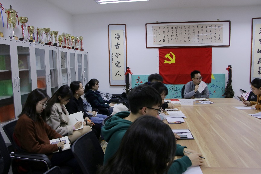 为进一步推进“不忘初心,牢记使命”主题教育活动向深走、向里走,同时提升同学们的思想高度、理论水平,11月11日,文化传播学院学生党支部在致远楼304会议室召开“不忘初心,牢记使命”主题教育专题党课。专题党课由文化传播学院党总支宣传委员王晨老师主讲,学生党支部成员、第29期党的发展对象到场聆听党课。