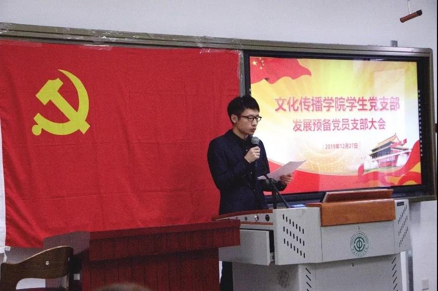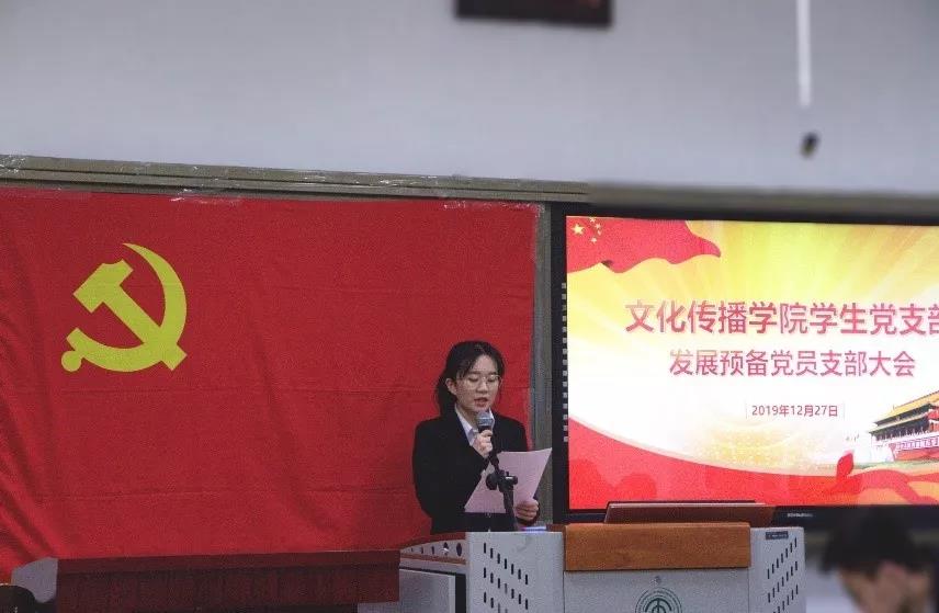 2019 年 12 月 27 日,文化传播学院学生党支部召开支部大会,讨论关于白雪、陈盼云、曹雅雪、何激昂、李敏、黄明珠、刘亚宇、姚耀共 8 位同志发展为中共预备党员的问题。参与此次会议的有文化传播学院党总支书记蔡月老师,学生党支部书记严芳芳老师、王晨老师。文化传播学院学生党支部预备党员及 2017 级部分入党积极分子到场旁听。本次大会具备表决权的党员应到 4 人,实到 3 人,符合党章要求。