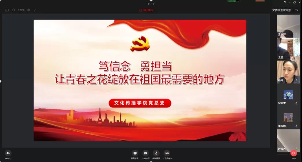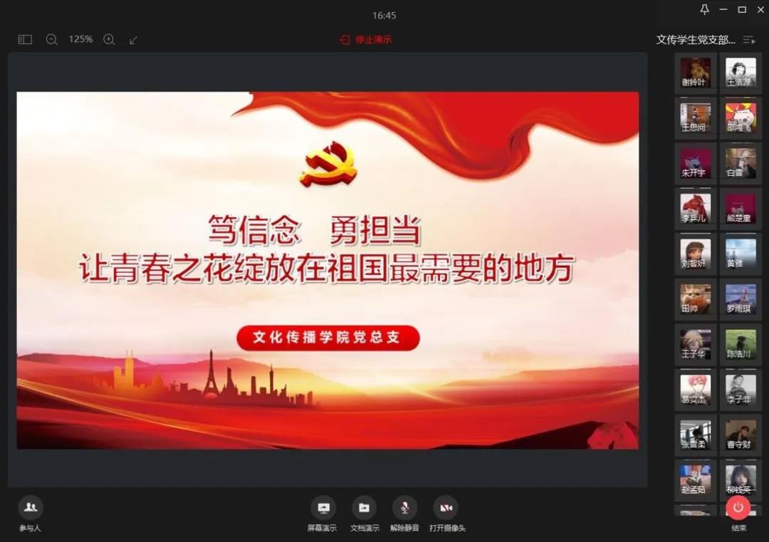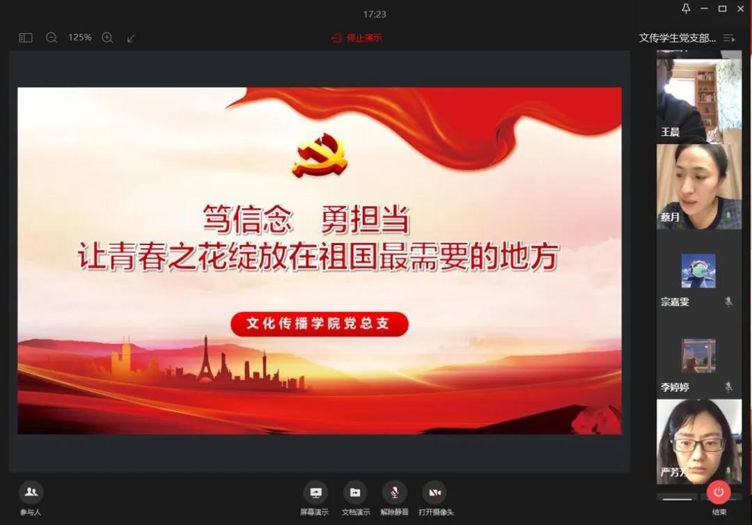 为进一步深入学习习近平总书记给北京大学援鄂医疗队全体“90 后”党员回信精神,切实增强青年学子责任感、使命感,3 月 27 日下午,文化传播学院党总支召开“笃信念、勇担当、让青春之花绽放在祖国最需要的地方”线上专题党课,组织学院学生党员、入党积极分子、各团支部共同深入研学总书记回信精神。专题党课由学院党总支书记蔡月老师主讲,学院学生党支部书记严芳芳老师主持,学院团总支书记王晨老师、2019 级辅导员王程羿老师参加会议。