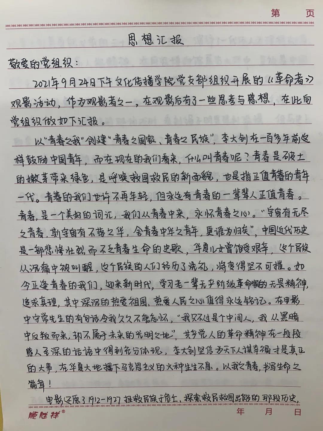 根据《文化传播学院党支部党史学习计划》安排,2021年9月24日下午,文化传播学院师生在北京校区致远楼105共同观看红色影片《革命者》,回顾“革命者”李大钊积极探索改变中国、拯救民族的热血历程,感悟建党百年征程和共产党人的革命信仰,自觉坚定初心和使命。