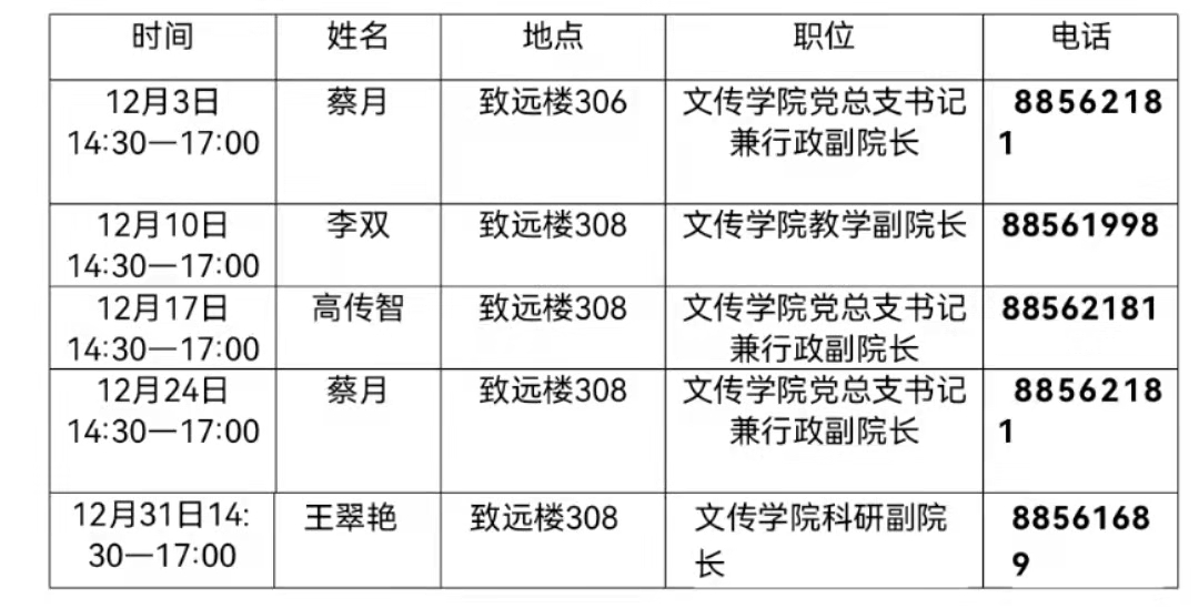1. 面对面每周五下午14:30—17:00学院院长在办公室接待师生,具体安排附后(文化传播学院院长接待日安排表)