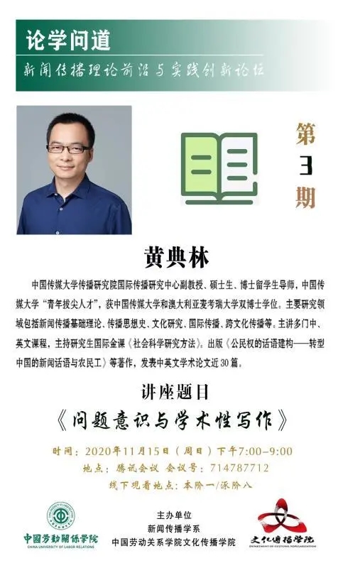 主讲人:黄典林 简介:中国传媒大学传播研究院国际传播研究中心副教授、硕士生、博士留学生导师,中国传媒大学“青年拔尖人才”,获中国传媒大学和澳大利亚麦考瑞大学双博士学位。主要研究领域包括新闻传播基础理论、传播思想史、文化研究、国际传播、跨文化传播等。主讲多门中、英文课程,主持研究生国际金课《社会科学研究方法》。出版《公民权的话语建构——转型中国的新闻话语与农民工》等著作,发表中英文学术论文近30篇。