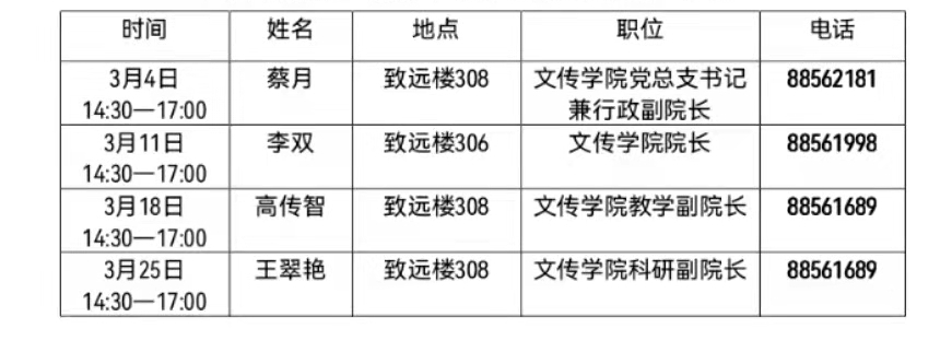 1. 面对面每周五下午14:30—17:00学院院长在办公室接待师生,具体安排附后(文化传播学院院长接待日安排表)