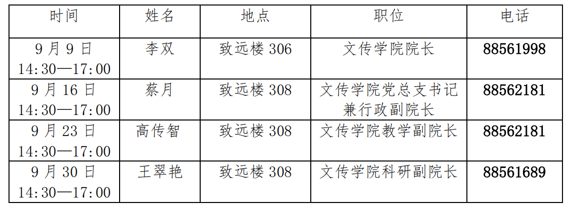 文化传播学院院长接待日安排表(9月)