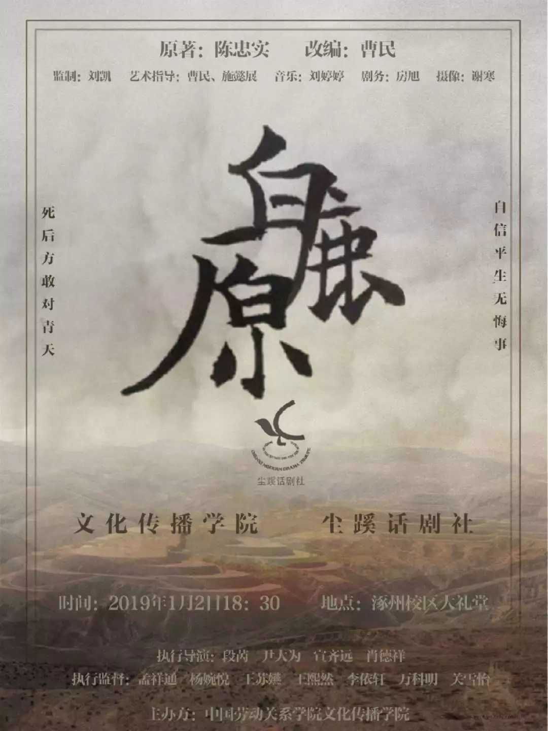 过完了元旦,又要上课了,距离放假还有一整个考试周。想必大家此刻心里是无比焦虑的,那不如在开学的第一天来欣赏文化传播学院尘蹊话剧社给大家带来的年度大戏《白鹿原》吧~
