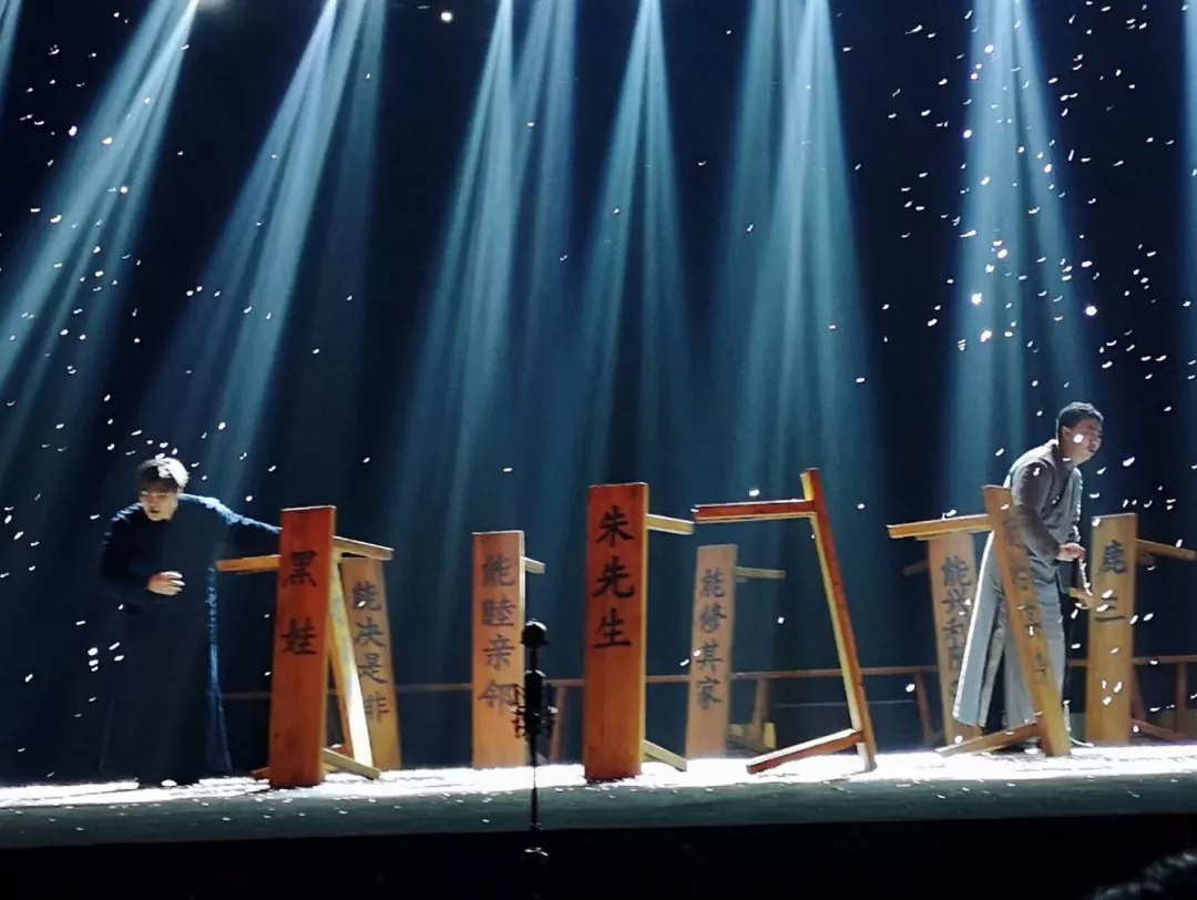 “台上一分钟,台下十年功”。仅仅一个月紧张的排练,让大家都顶着巨大的压力。要是再多一点排练时间该多好啊!然而,所有演员都挺过来了!天亮走进排练厅,天黑才能回到寝室——对每一句台词的细抠,对每一分情感的挖掘,甚至要一次一次战胜自己。主演们死啃原著,深挖剧本,竭尽全力去寻找所扮演人物的心理形体自我感觉;舞蹈演员几乎没有舞蹈基础,坚持一遍又一遍练习,洒下了一层又一层汗水;歌队演员手提、肩扛、高举的凳子就仿佛是他们的手脚,谁能想到一条凳子重达25斤!