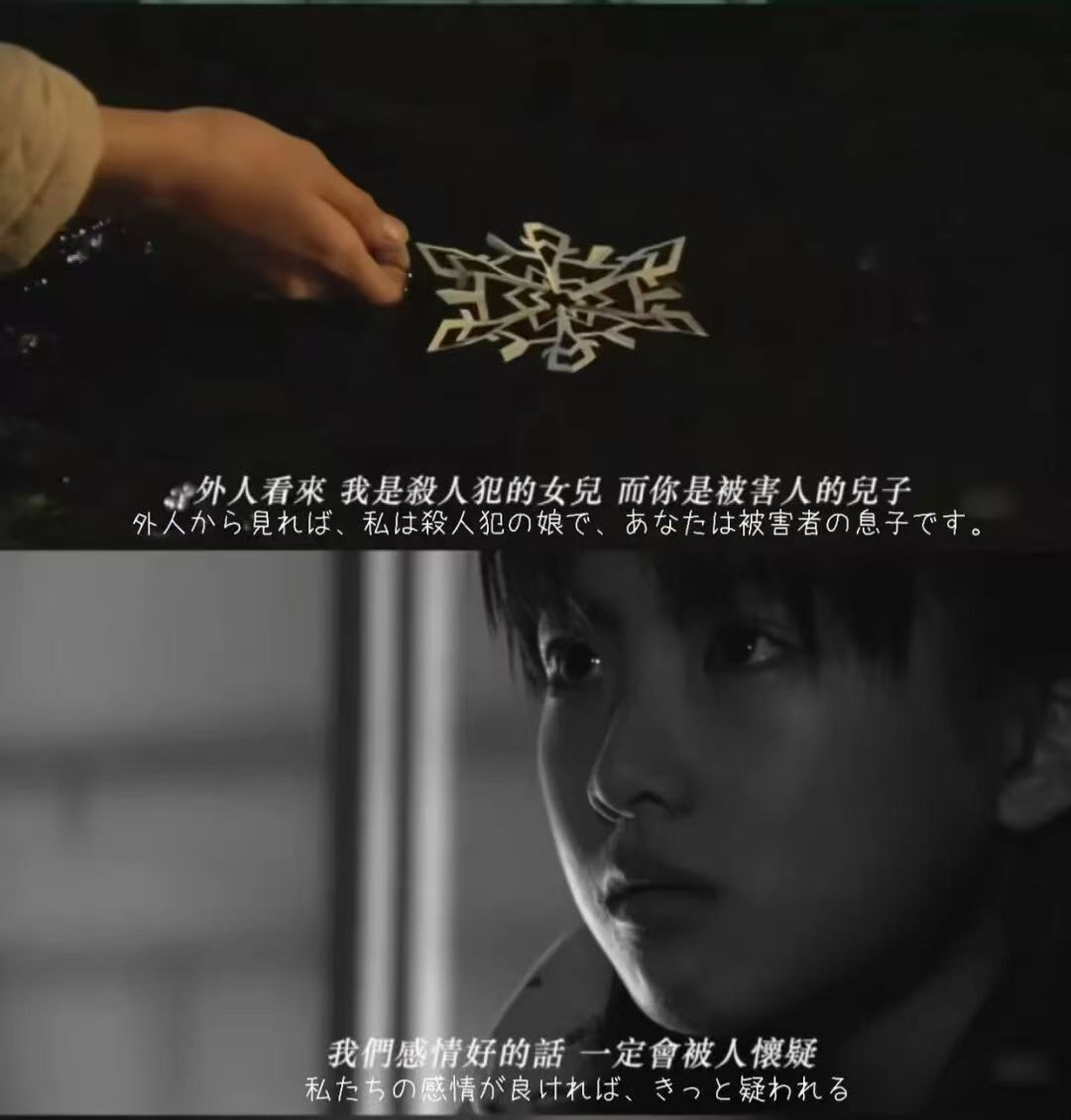 自始至终,他们没有一句被记录的对话,可两人的羁绊就像地下暗河与地表明河,永不交汇却同源共流。亮司扮成圣诞老人出现在雪穗的精品店,用曾经刺入父亲胸膛的剪刀裁剪着“在白天走路”的愿想。当他被警察围堵,从楼上纵身跃下,鲜血狂涌时,雪穗就站在楼梯上。