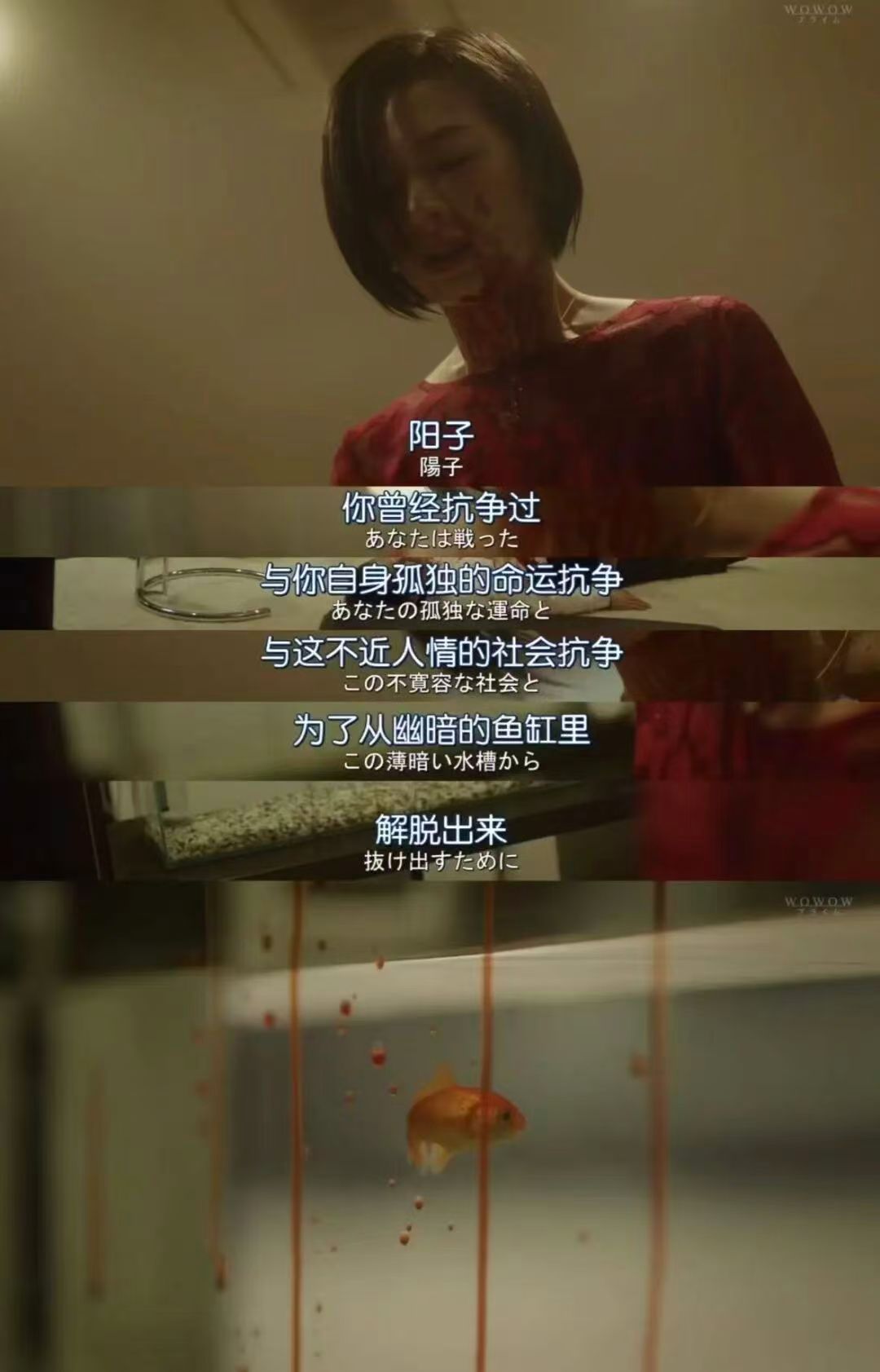 我记得妈妈总说,姐姐和我养的一条金鱼很像,都没精打采的。我看着姐姐把妈妈给的糖果让给我,看着她被爸爸的怒吼吓得躲在衣柜里哭,看着她在东京的出租屋里啃面包,看着那个叫芳贺的男人把她的自尊踩在脚下……