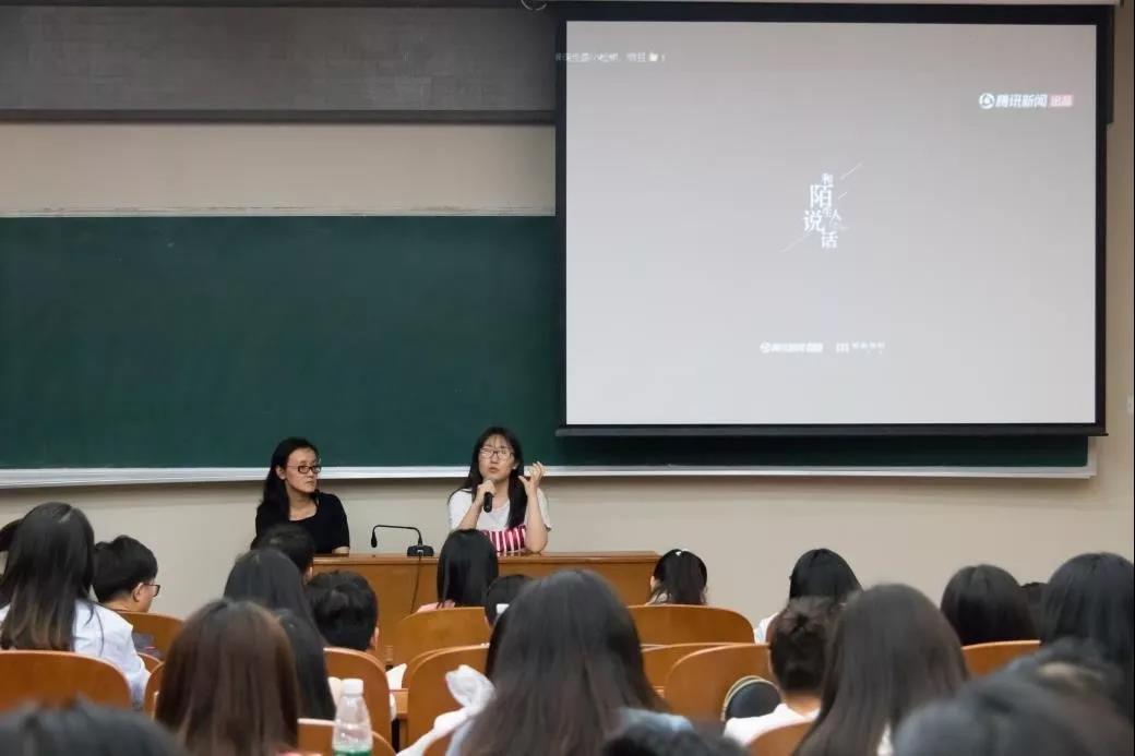 除观影活动以外,本次巡展还特地为学生们安排了与腾讯新闻出品的《和陌生人说话》的节目主创团队的交流会。团队主创人员为同学们介绍了在纪录片中所采用的竖屏式录播的特点,讲述了节目制作的背景、过程,进而满足同学们对创作方面的一些疑问。在近2小时的交流过程中,同学们各抒己见、畅所欲言,提出自己的疑问并进行讨论与交流。