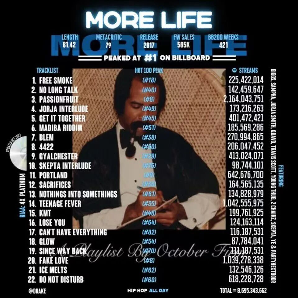 Drake在《More Life》用22首歌曲组成了一个能表达他当下生活状态的播放列表。据其团队OVO Sound透露,Drake在“Views Tour”巡演期间产生了许多音乐想法,他想把这些作品快速发布出来,但又担心整体准备不足,于是采用了“Playlist”这样稍显轻松的称呼。