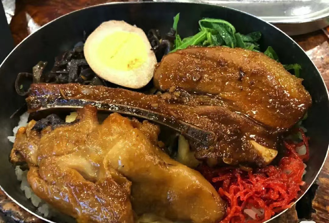 穿过铺满夏光的葡萄架,走进灰巷子,一路上坡。我记不清身边的模样,是挨家挨户的大门,还是一水的灰色砖瓦墙壁,我一直走,一直走,接近尽头——可能是小巷的尽头,也可能是记忆的尽头,拐进巷子的小岔口,接连走下n级台阶,便进了一片下沉的空间,不同于渐浓的夕阳,房间里暗暗的,是被时光遗忘的过往纪念……最原始的铁皮饭盒,因为回收不佳成本高而演变成木片,到现在已经用纸盒包装贩售……我仍记得那铁皮的温度,是一种细腻的温暖,能够渗透我掌心的每条纹路……一片排骨肉、一枚切开的卤蛋、一片豆干、几片萝卜干,漫漫旅途需要饭菜的质量和好口感,菜品出水就会变质,因此便当以干菜为主。拨开肉片水蒸气微醺熟米,轻挂内壁,卤香间缭绕……