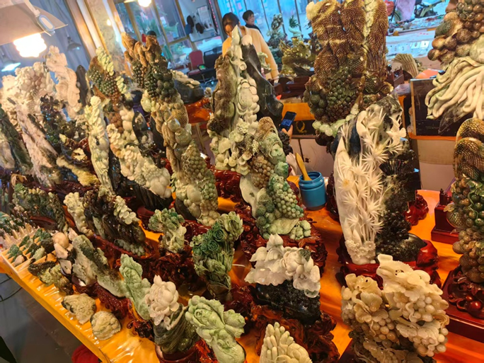 大年初五,我和大伯、小宇一起去了石佛寺,这里是镇平玉雕产业的核心,与小西营的冷清形成了鲜明的对比。庙会上,人头攒动,各式各样的玉件摆满了摊位,玉雕匠人现场雕刻、展示,直播间的主播们拿着玉件,对着镜头吆喝,线上线下,热闹非凡。在这里,我看到了镇平玉雕产业的另一种可能,也看到了镇平玉雕的微光。