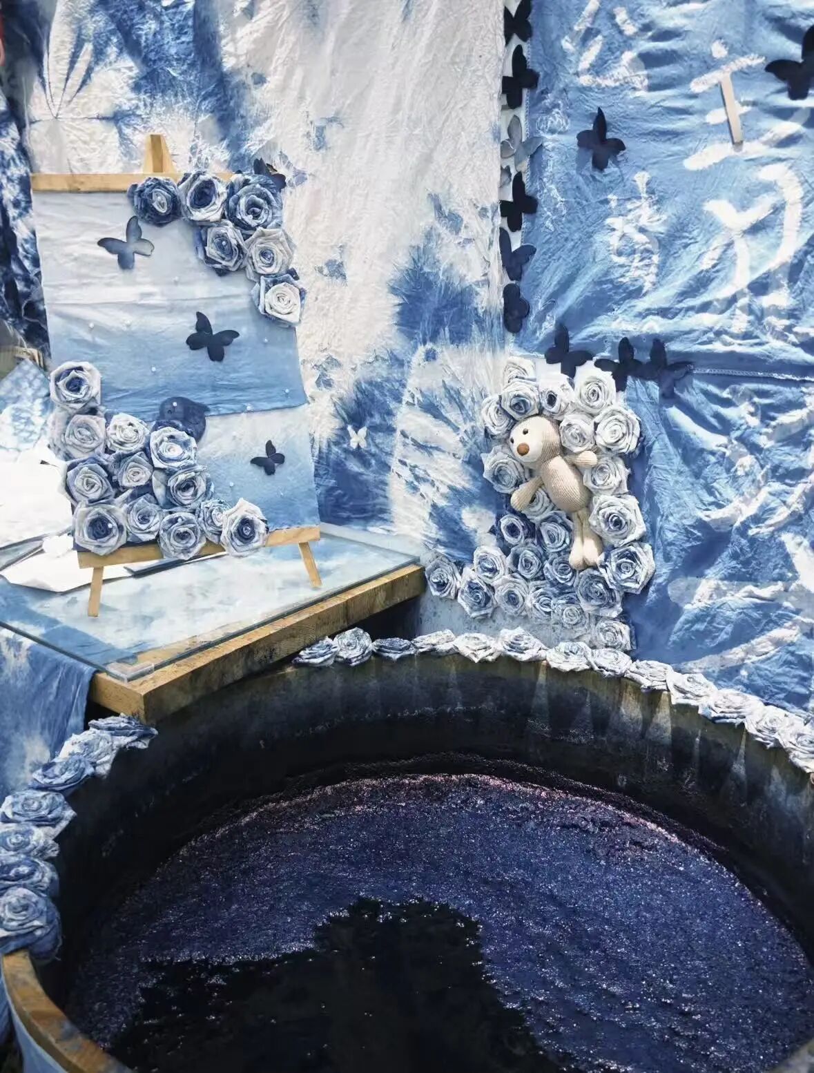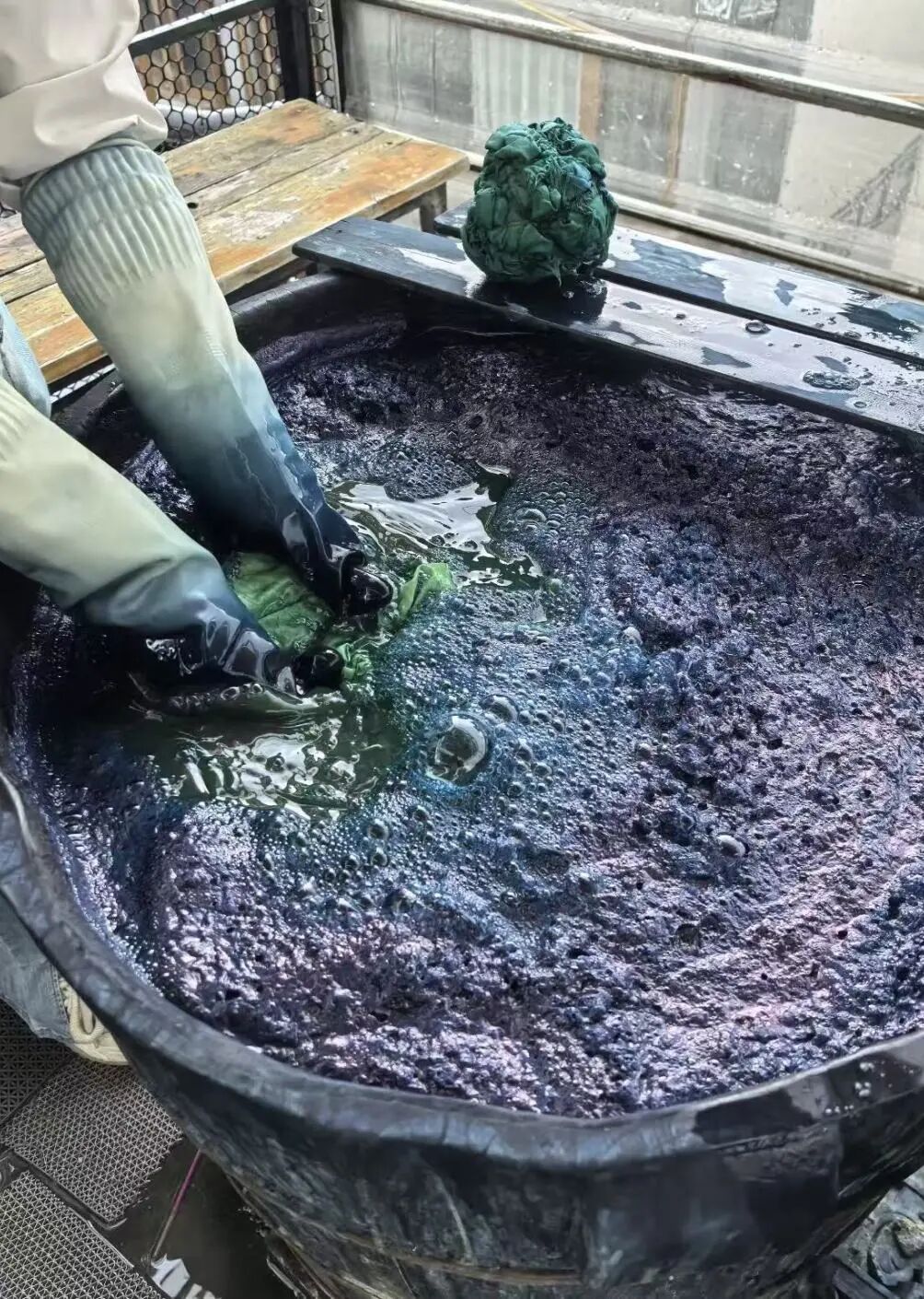 扎染的本质,是用线绳对抗染料的入侵:被捆扎、缝缀、折叠的部分拒斥色彩,未被束缚的区域则任由蓝晕漫染,最终展开时,每道褶皱的缝隙里都藏着独一份的纹理,连匠人也猜不透最终的图案。