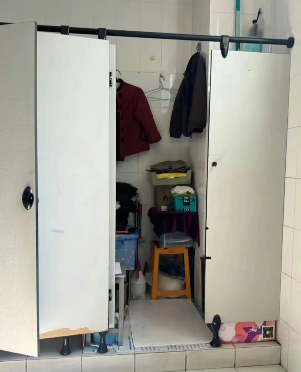 许萍是一位普通的保洁员。中午,卫生间一角,她正捧着饭盒吃午餐,面朝大垃圾桶,左侧是拖把池,右侧挨着厕所隔门,身边的对讲机随时会传来指令——哪里脏了要去处理一下。近期,许萍阿姨在卫生间吃饭的照片引发网友关注。一些网友发出“卫生间最后一个隔间”的照片,原来像许萍这样“抓紧吃饭”“生怕耽误工作”的保洁员不只一个。从“卫生间最后一个隔间”可以看到,拖把、垃圾桶与保洁员的私人衣物混放在一起,那是保洁员们的“休息室”。