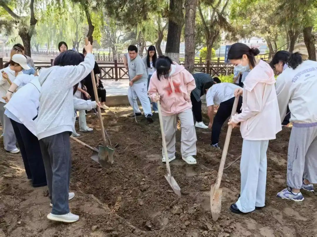 上午九点,十余名同学陆续抵达水上公园。大家有序领取工具,耕种战役正式打响。首先进行对土地的翻耕开垦,同学们运用铁锹、锄头等各种劳动工具翻动泥土。黄瀚同学奋勇担任主力工作,不多时,汗水便布满脸颊。随着表层土壤逐渐松动,同学们不断遇到各种大小砖块、草根作阻挠,但在大家的齐心协力下,麻烦逐一被攻破。接着,在李宝帅、李宸等同学的带领下,大家分组开沟起垄。原本板结坚硬的土地在不懈的努力下变得松散柔软,五条笔直整齐的沟垄初现雏形。同学们配合十分默契,全身心投入,田地上不断回响着欢笑声。最后,同学们将蓝莓苗种进土里,再进行浇水灌溉,播下的种子在湿润的土层里静静安睡,每一粒都藏着对丰收的期待。经过一个多小时的努力,本次活动圆满结束。
