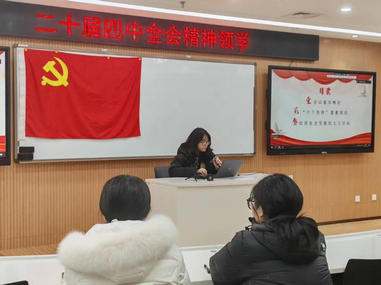 领学人于锐婕对第二十届四中全会精神进行深化解读,带领同学们梳理了会议基本概况,对“六个坚持”重要原则中“坚持党的全面领导、坚持人民至上、坚持高质量发展” 等核心遵循内涵进行详细阐释;针对经济社会发展七大目标,重点带领大家解读“高质量发展取得显著成效、科技自立自强水平大幅提高、美丽中国建设取得新进展”等关键任务。