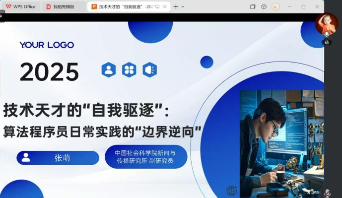 2025 年3月26日晚19时,中国劳动关系学院研究生处主办、文化传播学院承办的增光传媒前沿论坛“传播与社会发展”讲座,通过腾讯会议线上开展。本次讲座以“技术天才的自我驱逐:算法程序员日常实践的边界逆向”为题,由中国社科院新闻与传播研究所副研究员、传媒发展研究中心副主任张萌老师主讲,文化传播学院副院长吴麟老师主持,23级及24级新闻与传播专业研究生参加。