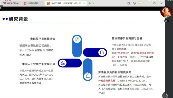 研究方法选取部分,张萌老师重点阐述了深度访谈法的运用。具体而言,她通过熟人推荐和线上偶遇的方式,精心挑选了22位从事算法工作的程序员进行深入访谈。访谈内容围绕非专业人士、平台、外围用户这三个方面展开,深入探讨了程序员在日常实践中的边界互动。
