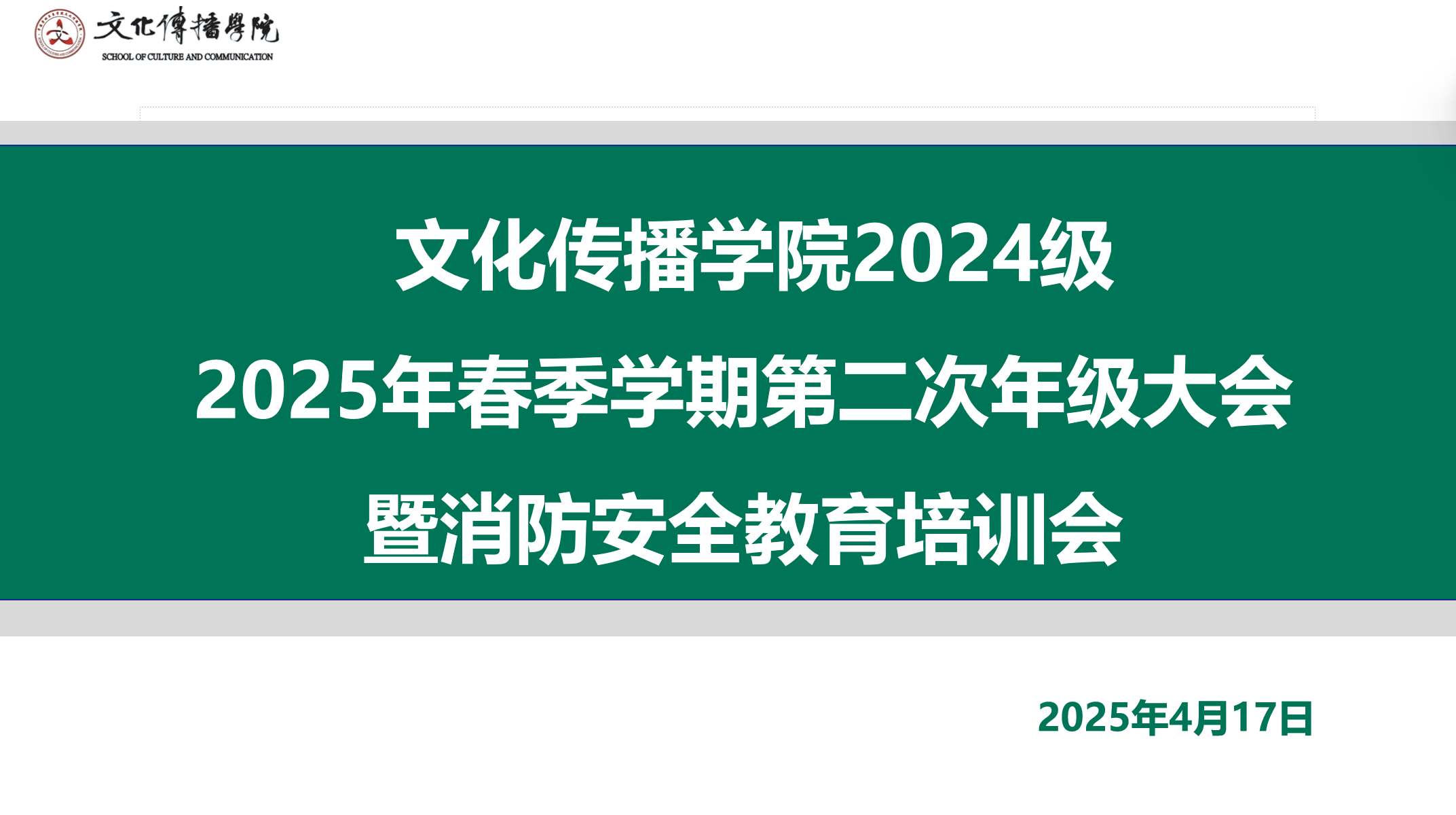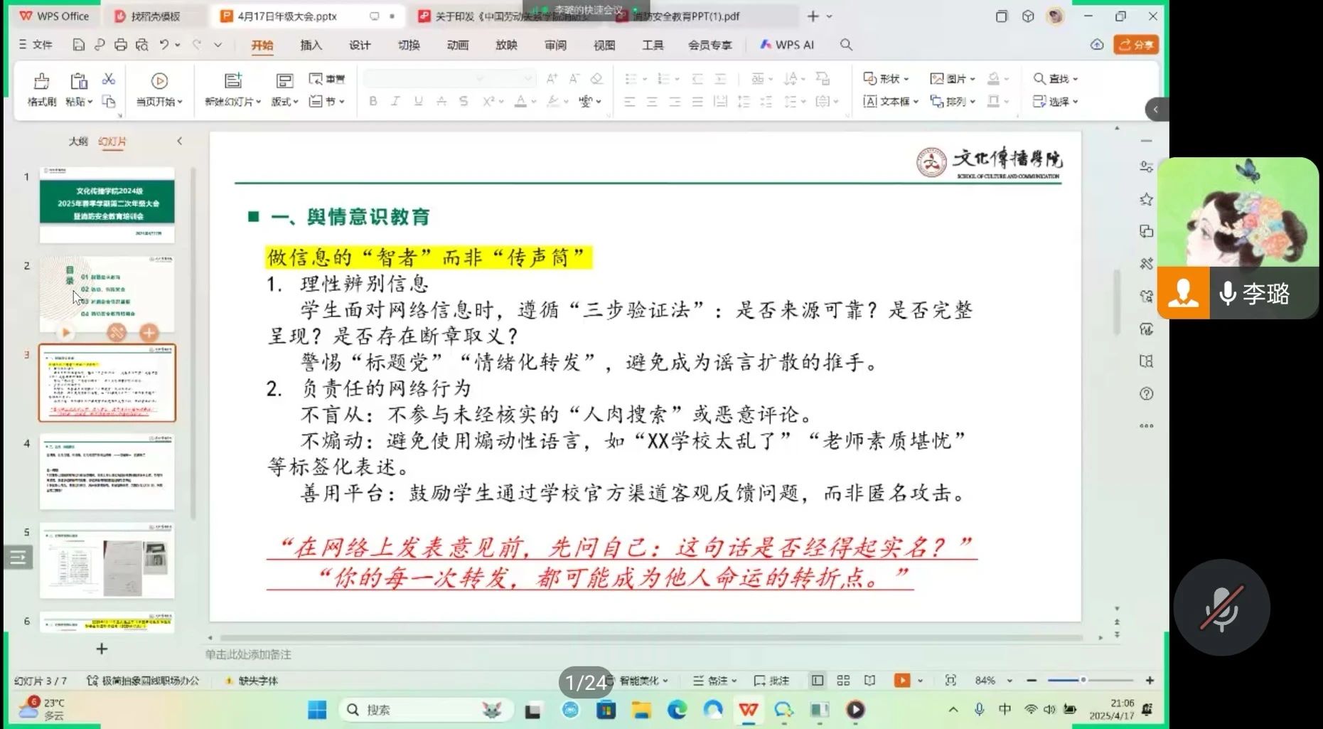2025年4月17日20:30,文化传播学院2025年春季学期第二次年级大会暨消防安全教育培训会在线上召开,2024级辅导员李璐老师主持,2024级全体同学参会。大会围绕舆情意识教育、活动及假期安全、宿舍安全通报、消防安全教育培训四个主题展开。
