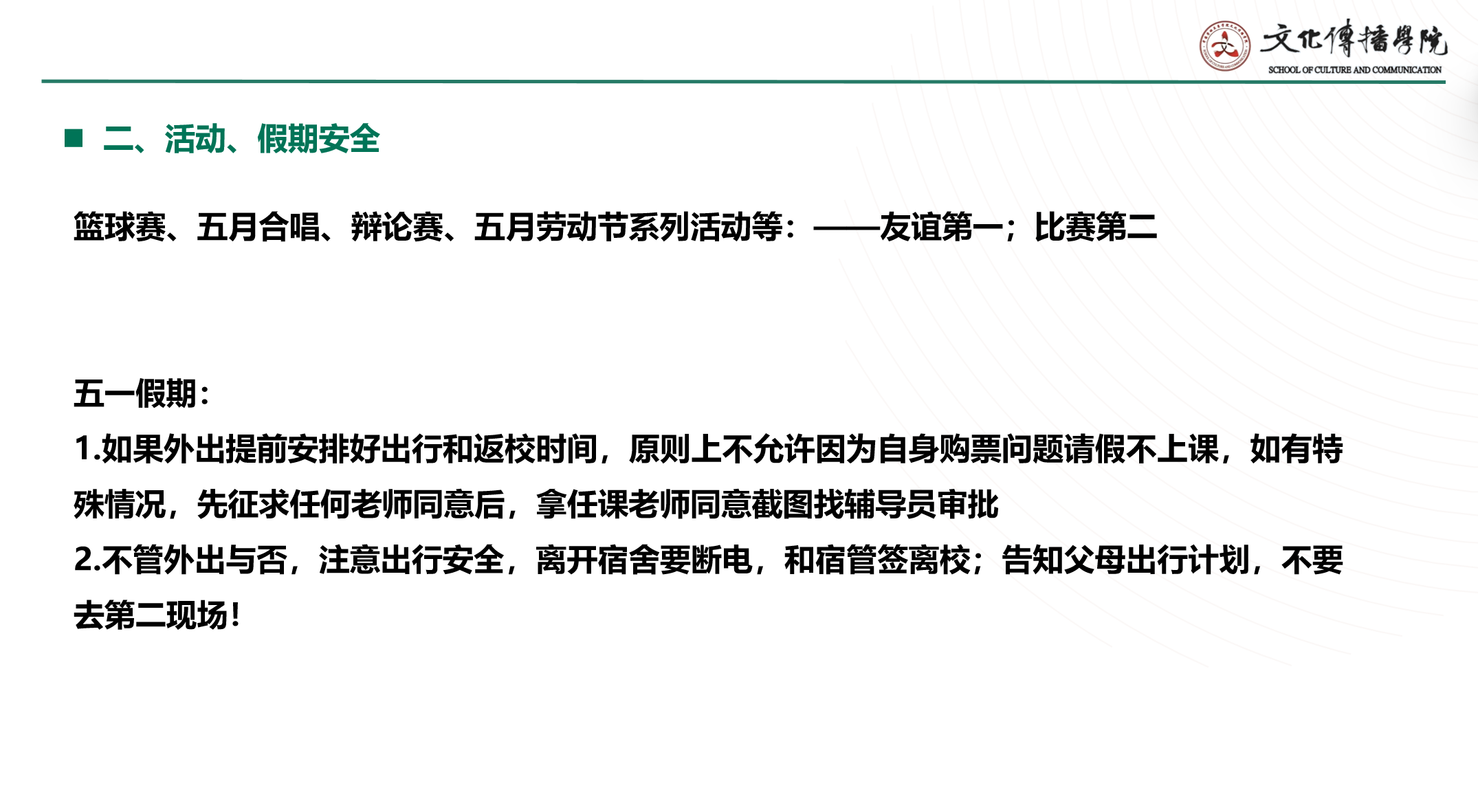 其次,最近校内活动较多,李璐老师希望大家弘扬“友谊第一,比赛第二”的精神,用掌声为对手喝彩,用拥抱化解比分争议;临近五一假期,老师也提醒同学们合理安排时间,注意宿舍卫生、用电安全及出行报备,增强危险防范意识,保护好自己。