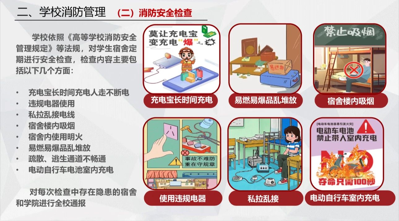 在宿舍安全通报方面,李璐老师展示了近期发生的典型违规案例,同时传达了学校将依据《中国劳动关系学院消防安全管理暂行规定(2025修订版)》加强宿舍安全检查管理的通知要求。特别提醒同学们务必提高安全意识,严格遵守用电用火规定,共同维护集体生活环境的安全。